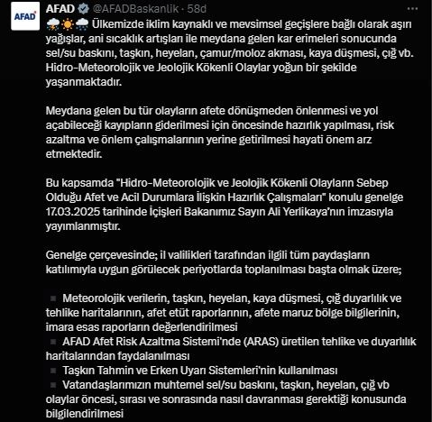 ANKARA, (DHA)- İÇİŞLERİ Bakanlığı, 81 il valiliğine 'Hidro-Meteorolojik ve Jeolojik Kökenli Olayların Sebep Olduğu Afet ve Acil Durumlara İlişkin Hazırlık Çalışmaları' konulu genelge gönderdi.Afet ve Acil Durum Yönetimi Başkanlığı'ndan yapılan açıklamada, ülkede iklim kaynaklı ve mevsimsel geçişlere bağlı olarak aşırı yağışlar, ani sıcaklık artışları ile meydana gelen kar erimeleri sonucunda sel/su baskını, taşkın, heyelan, çamur/moloz akması, kaya düşmesi, çığ gibi hidro-meteorolojik ve jeolojik kökenli olayların yoğun yaşandığına dikkat çekildi. Meydana gelen bu tür olayların afete dönüşmeden önlenmesi ve yol açabileceği kayıpların giderilmesi için öncesinde hazırlık yapılması, risk azaltma ve önlem çalışmalarının yerine getirilmesinin hayati önem arz ettiği vurgulandı. Bu kapsamda 'Hidro-Meteorolojik ve Jeolojik Kökenli Olayların Sebep Olduğu Afet ve Acil Durumlara İlişkin Hazırlık Çalışmaları' konulu genelgenin 17.03.2025 tarihinde İçişleri Bakanı Ali Yerlikaya’nın imzasıyla yayımlandığı belirtilerek şöyle denildi:"Genelge çerçevesinde; il valilikleri tarafından ilgili tüm paydaşların katılımıyla uygun görülecek periyotlarda toplanılması başta olmak üzere; Meteorolojik verilerin, taşkın, heyelan, kaya düşmesi, çığ duyarlılık ve tehlike haritalarının, afet etüt raporlarının, afete maruz bölge bilgilerinin, imara esas raporların değerlendirilmesi; AFAD Afet Risk Azaltma Sistemi'nde (ARAS) üretilen tehlike ve duyarlılık haritalarından faydalanılması; Taşkın Tahmin ve Erken Uyarı Sistemleri'nin kullanılması; Vatandaşlarımızın muhtemel sel/su baskını, taşkın, heyelan, çığ vb olaylar öncesi, sırası ve sonrasında nasıl davranması gerektiği konusunda bilgilendirilmesi; Kritik tesis ve altyapıların bulunduğu yerlerin afet risk değerlendirmelerinin yapılarak gerekli tedbirlerin alınması; Taşkın tahliye prosedürlerinin belirlenmesi; Meteorolojik uyarı durumunda acil müdahale ekiplerinin teyakkuz durumuna geçirilmesi, 24 saat vardiyalı çalışma sisteminin uygulanması gibi tedbirler belirlenerek, 81 il valiliğine iletilmiştir."Açıklamada, "'Olmadan önle' anlayışı doğrultusunda devletimizin tüm kurumları, tam koordinasyon halinde ve hep birlikte çalışmaya devam ediyor" ifadeleri kullanıldı. (DHA)