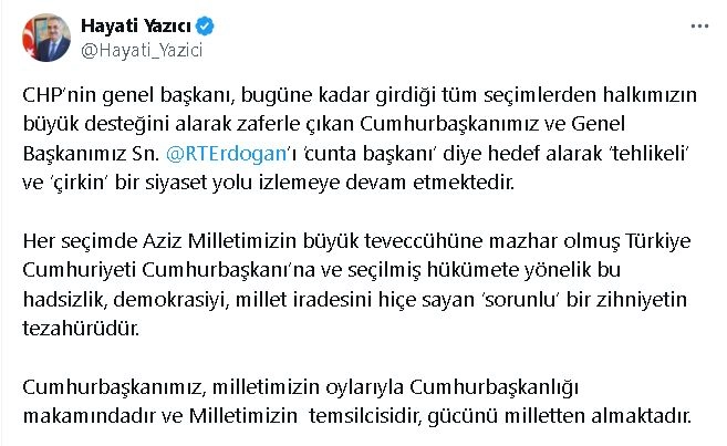 ANKARA, (DHA)- AK Parti Genel Başkan Yardımcısı Hayati Yazıcı, "Demokrasiden yana olan herkes CHP'nin provokatif diline karşı durmalıdır. Milletimiz demokrasiyi hazmedemeyenlere mutlaka cevabını verecektir" dedi.AK Parti'li Yazıcı, sosyal medya hesabından yaptığı açıklamada, "CHP'nin Genel Başkanı, bugüne kadar girdiği tüm seçimlerden halkımızın büyük desteğini alarak zaferle çıkan Cumhurbaşkanımız ve Genel Başkanımız Sayın Recep Tayyip Erdoğan'ı 'cunta başkanı' diye hedef alarak tehlikeli ve çirkin bir siyaset yolu izlemeye devam etmektedir. Her seçimde aziz milletimizin büyük teveccühüne mazhar olmuş Türkiye Cumhuriyeti Cumhurbaşkanına ve seçilmiş hükümete yönelik bu hadsizlik, demokrasiyi, millet iradesini hiçe sayan sorunlu bir zihniyetin tezahürüdür. Cumhurbaşkanımız, milletimizin oylarıyla Cumhurbaşkanlığı makamındadır ve milletimizin temsilcisidir, gücünü milletten almaktadır" ifadelerini kullandı.'PROVOKATİF DİLLE SORUMLULUKTAN KAÇAMAZSINIZ'Milli iradeyi içine sindiremeyenlerin, milletin nezdinde yeri olmadığını aktaran Yazıcı, "CHP, suçüstü yakalanmanın paniğini yaşamaktadır. Yolsuzluk iddialarına tek bir kelime etmeden seçilmiş Cumhurbaşkanımızı, seçilmiş iktidarı hedef almaları bu paniğin göstergesidir. Hakaret, iftira, tehdit içeren bu provokatif dille sorumluluktan kaçamazsınız. CHP'ye düşen bağımsız ve tarafsız yargının konuyu aydınlatmasını beklemektir. Bu tür savrulmalar CHP'yi iktidar yapmaz, millet nezdinde ancak itibarsızlaştırır. Anayasal kurumlara, demokrasiye, milli iradeye, meşru ve demokratik yollardan seçilen Cumhurbaşkanlığı makamına saygı, herkesin vazifesi olduğu gibi muhalefetin de vazifesidir. Ana muhalefetin genel başkanını, milletimizden ve Sayın Cumhurbaşkanımızdan özür dilemeye davet ediyorum. Demokrasiden yana olan herkes CHP'nin bu provokatif diline karşı durmalıdır. 'İnsanın kafasında ya fikir olur ya küfür.' Belli ki fikir yok, kafa küfürle dolu. İşte sorun budur. Milletimiz demokrasiyi hazmedemeyenlere mutlaka cevabını verecektir. Bu zihniyete karşı demokrasi ve hukuk temelinde sonuna kadar mücadele edeceğiz" açıklamasında bulundu. (DHA)