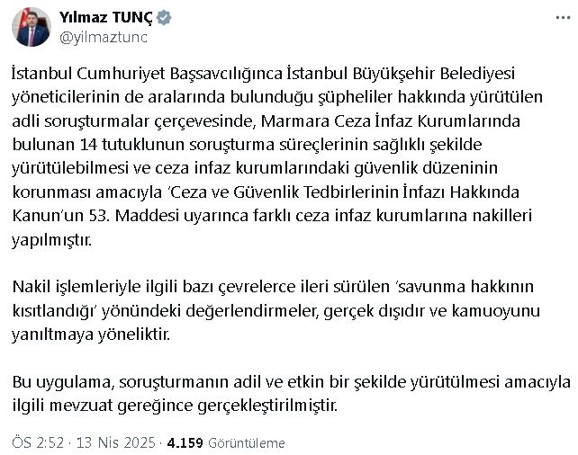 ANKARA, (DHA)- ADALET Bakanı Yılmaz Tunç, Marmara Ceza İnfaz Kurumlarında bulunan 14 tutuklunun, farklı ceza infaz kurumlarına nakilleri ile ilgili ileri sürülen 'savunma hakkının kısıtlandığı' yönündeki değerlendirmelerin gerçek dışı olduğunu belirtti. Bakan Tunç, sosyal medya hesabından yaptığı açıklamada, "İstanbul Cumhuriyet Başsavcılığı'nca İstanbul Büyükşehir Belediyesi yöneticilerinin de aralarında bulunduğu şüpheliler hakkında yürütülen adli soruşturmalar çerçevesinde, Marmara Ceza İnfaz Kurumlarında bulunan 14 tutuklunun soruşturma süreçlerinin sağlıklı şekilde yürütülebilmesi ve ceza infaz kurumlarındaki güvenlik düzeninin korunması amacıyla Ceza ve Güvenlik Tedbirlerinin İnfazı Hakkında Kanun'un 53'üncü maddesi uyarınca farklı ceza infaz kurumlarına nakilleri yapılmıştır. Nakil işlemleriyle ilgili bazı çevrelerce ileri sürülen 'savunma hakkının kısıtlandığı' yönündeki değerlendirmeler, gerçek dışıdır ve kamuoyunu yanıltmaya yöneliktir. Bu uygulama, soruşturmanın adil ve etkin bir şekilde yürütülmesi amacıyla ilgili mevzuat gereğince gerçekleştirilmiştir" ifadelerini kullandı. (DHA)