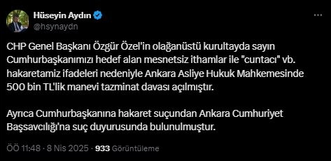 ANKARA, (DHA)- CUMHURBAŞKANI Recep Tayyip Erdoğan'ın avukatı Hüseyin Aydın, CHP Genel Başkanı Özgür Özel hakkında, Cumhurbaşkanı Erdoğan'a yönelik sözleri nedeniyle 500 bin TL'lik manevi tazminat davası açıldığını duyurdu.Cumhurbaşkanı Recep Tayyip Erdoğan'ın avukatı Hüseyin Aydın, sosyal medya hesabından yaptığı açıklamada, "CHP Genel Başkanı Özgür Özel'in olağanüstü kurultayda Sayın Cumhurbaşkanımızı hedef alan mesnetsiz ithamlar ile 'cuntacı' ve benzeri hakaretamiz ifadeleri nedeniyle Ankara Asliye Hukuk Mahkemesi'nde 500 bin TL'lik manevi tazminat davası açılmıştır. Ayrıca 'Cumhurbaşkanına hakaret' suçundan Ankara Cumhuriyet Başsavcılığı'na suç duyurusunda bulunulmuştur" ifadelerini kullandı. (DHA)