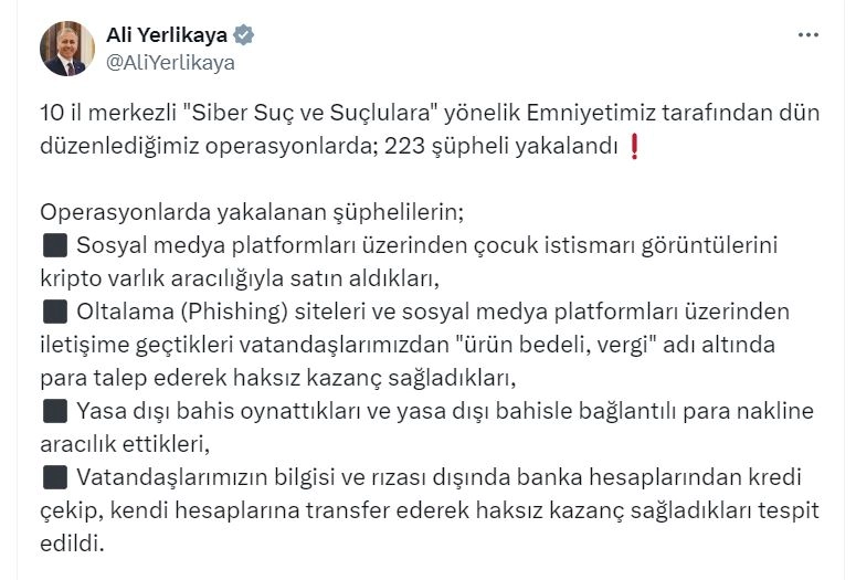 ANKARA, (DHA)- İÇİŞLERİ Bakanı Ali Yerlikaya, siber suç ve suçlulara yönelik 10 il merkezli 31 ilde düzenlenen operasyonlarda 223 şüphelinin yakalandığını duyurdu.Bakan Yerlikaya, sosyal medya hesabından yaptığı açıklamada, cumhuriyet başsavcılıkları ile Emniyet Genel Müdürlüğü Siber Suçlarla Mücadele Daire Başkanlığı koordinesinde, dün siber suç ve suçlulara yönelik 10 il merkezli 31 ilde düzenlenen operasyonlarda 223 şüphelinin yakalandığını belirtti. Yerlikaya, "Operasyonlarda yakalanan şüphelilerin; sosyal medya platformları üzerinden çocuk istismarı görüntülerini kripto varlık aracılığıyla satın aldıkları, oltalama (phishing) siteleri ve sosyal medya platformları üzerinden iletişime geçtikleri vatandaşlarımızdan 'ürün bedeli, vergi' adı altında para talep ederek haksız kazanç sağladıkları, yasa dışı bahis oynattıkları ve yasa dışı bahisle bağlantılı para nakline aracılık ettikleri, vatandaşlarımızın bilgisi ve rızası dışında banka hesaplarından kredi çekip, kendi hesaplarına transfer ederek haksız kazanç sağladıkları tespit edildi" dedi.'SANAL DEVRİYELERİMİZ 7/24 GÖREVLERİNİN BAŞINDA'Şüpheliler hakkında; bilişim sistemlerinin kullanılması suretiyle nitelikli dolandırıcılık, yasa dışı bahis, çevrim içi çocuk müstehcenliği ve tacizi, nitelikli hırsızlık suçlarından soruşturma başlatıldığını kaydeden Yerlikaya, "Operasyonlar sonucu çok sayıda dijital materyale el konuldu. Valilerimizi, operasyonları koordine eden cumhuriyet başsavcılıklarımızı, MASAK'ımızı operasyonları gerçekleştiren kahraman polislerimizi tebrik ediyorum. Siber Vatan’da sanal devriyelerimiz 7 gün 24 saat görevlerinin başında. Siber suçlar ve suçlularla mücadelemiz aralıksız devam ediyor" açıklamasında bulundu. (DHA)