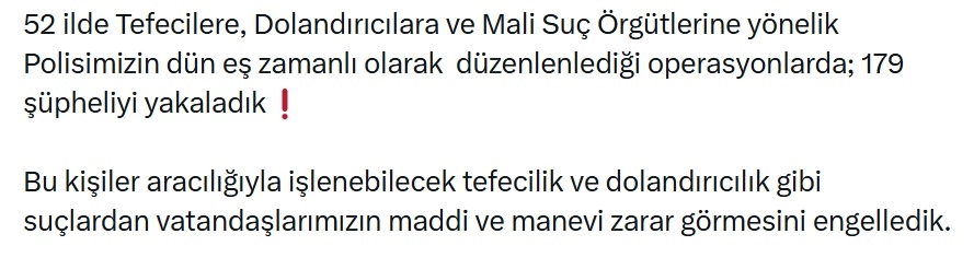 İçişleri Bakanı Yerlikaya, polis tarafından düzenlenen operasyonu sosyal medya hesabından duyurdu. Buna göre; 'Tefecilik', 'Nitelikli dolandırıcılık', 'Kamu kurum ve kuruluşlarının zararına yönelik nitelikli dolandırıcılık', 'İhaleye fesat karıştırma', 'Rüşvet', 'Zimmet ve irtikap', 'Vergi usul kanununa muhalefet', 'Görevi kötüye kullanma', 'Resmi belgede sahtecilik', 'Parada sahtecilik', 'ÖSYM Kanunu'na muhalefet' suçlarına yönelik düzenlenen operasyonda 179 şüpheli yakalandı. Şüpheliler haklarında, adli işlem başlatıldı. (DHA)