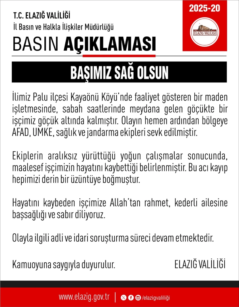 CANSIZ BEDENİNE ULAŞILDIElazığ’ın Palu ilçesine bağlı Kayaönü köyünde faaliyet gösteren maden işletmesinde meydana gelen göçükte mahsur kalan işçinin 4 çocuk babası Hasan Coşkun (45) olduğu belirlendi. Ekiplerin çalışmasıyla, Coşkun’un cansız bedenine ulaşıldı. Coşkun’un cenazesinin madenden çıkarılması için çalışmalar sürüyor.VALİLİK: ADLİ VE İDARİ SORUŞTURMA SÜRECİ DEVAM ETMEKTEDİRElazığ Valiliği’nden yapılan yazılı açıklamada, olaya ilişkin adli ve idari soruşturmanın devam ettiği belirtilerek, “İlimiz Palu ilçesi Kayaönü köyünde faaliyet gösteren bir maden işletmesinde, sabah saatlerinde meydana gelen göçükte bir işçimiz göçük altında kalmıştır. Olayın hemen ardından bölgeye AFAD, UMKE, sağlık ve jandarma ekipleri sevk edilmiştir. Ekiplerin aralıksız yürüttüğü yoğun çalışmalar sonucunda, maalesef işçimizin hayatını kaybettiği belirlenmiştir. Bu acı kayıp hepimizi derin bir üzüntüye boğmuştur. Hayatını kaybeden işçimize Allah'tan rahmet, kederli ailesine başsağlığı ve sabır diliyoruz. Olayla ilgili adli ve idari soruşturma süreci devam etmektedir. Kamuoyuna saygıyla duyurulur” denildi. Tekin YALÇINKAYA/ELAZIĞ, (DHA)