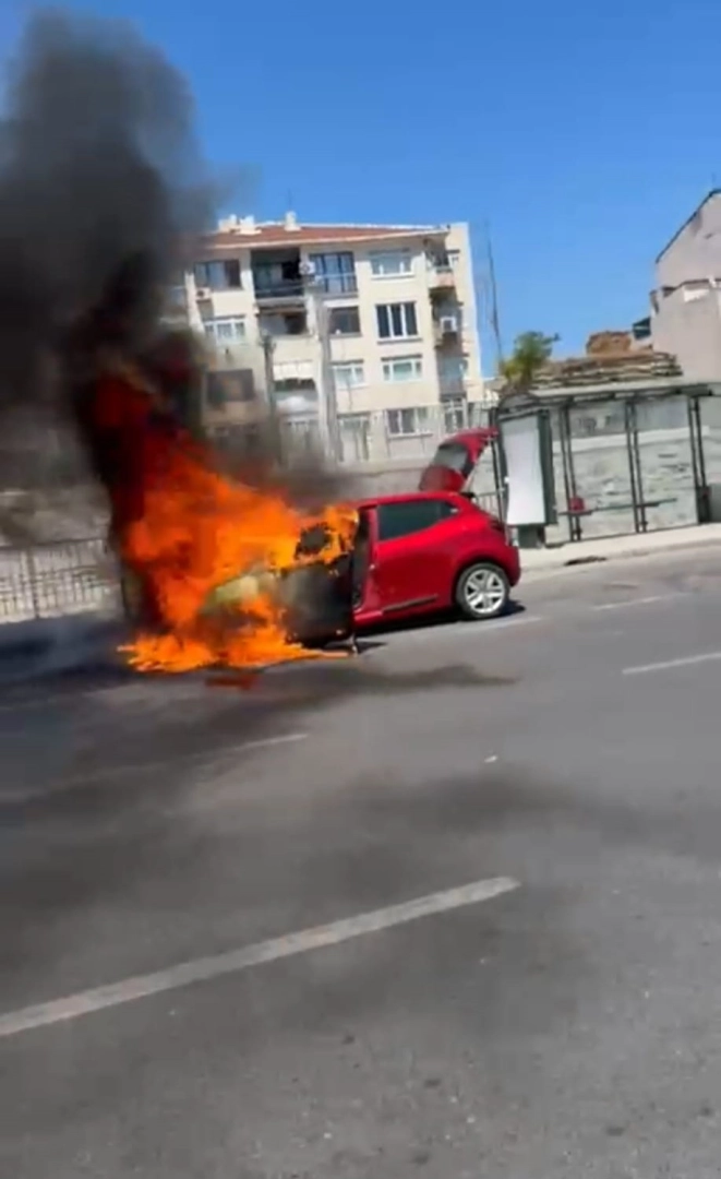 Emre KURT-Uğur ŞAHİN-Utku Can SÖNMEZ/İSTANBUL,(DHA)- FATİH'te seyir halindeki otomobilin motor kısmında çıkan yangın kısa sürede söndürüldü. Otomobil kullanılmaz hale gelirken o anlar cep telefonu kameralarıyla kaydedildi. Yangın, saat 14.00 sıralarında Kennedy Caddesi'nde seyir halinde olan 34 FIE 905 plakalı otomobilde çıktı. Zeytinburnu istikametinde ilerleyen otomobilin motor kısmından dumanların yükseldiğini gören sürücü, aracını otobüs durağına çekti. Çevredekilerin ihbarı üzerine olay yerine polis ve itfaiye ekibi sevk edildi. Polis ekipleri yolda güvenlik önlemi alırken, otomobilin motor bölümünden alevler yükseldi. İtfaiye ekiplerinin müdahalesiyle söndürülen yangında otomobil kullanılmaz hale geldi. Olayda ölen ya da yaralanan olmazken demir yığınına dönen araç çekiciyle kaldırıldı. (DHA)