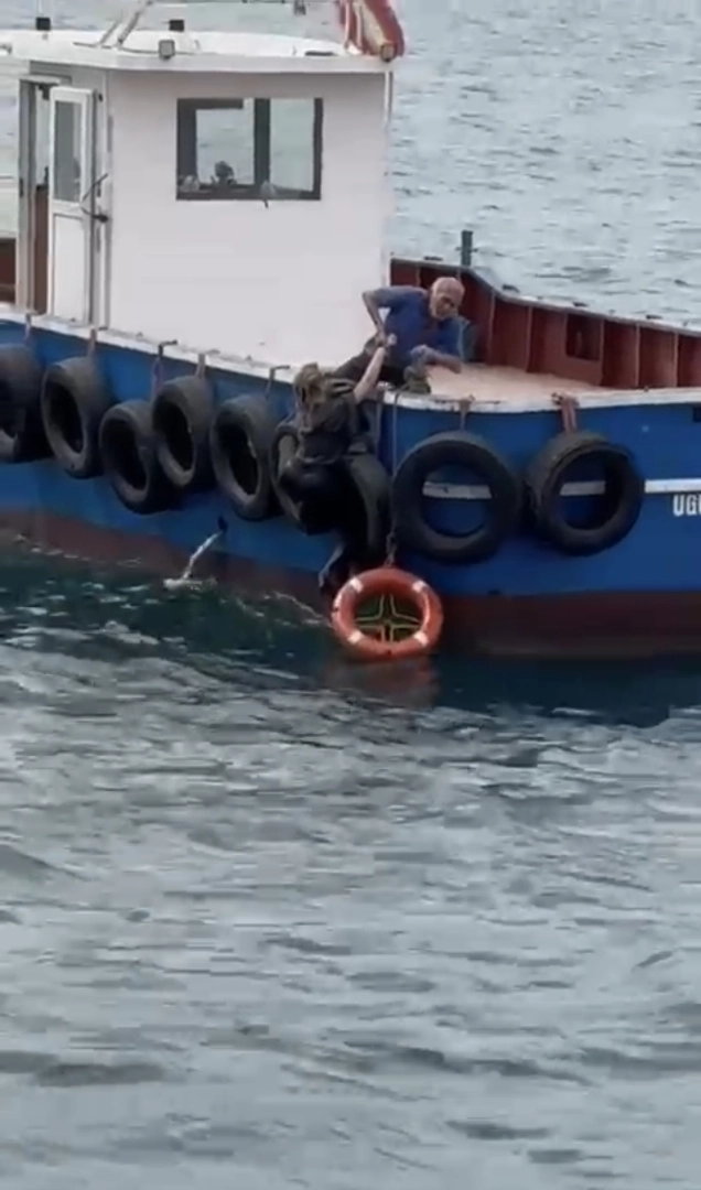 Mert ORDU/İSTANBUL, (DHA) – KARTAL açıklarında yolcu vapurundan denize düşen kadını, balıkçı teknesinden atılan can simidi ile kurtarıldı. O anlar cep telefonu kamerasına yansıdı.Olay bugün Kartal açıklarında meydana geldi. Yolcu vapurundaki bir kadın, henüz bilinmeyen bir sebeple denize düştü. Vapurdaki diğer yolcular durumu görevlilere bildirirken, yakındaki bir balıkçı teknesinden denize can simidi atıldı. Can simidine tutunan kadın balıkçı teknesindekiler tarafından sudan çıkarıldı. Kıyıya getirilerek sağlık ekiplerine teslim eden kadının, sağlık durumunun iyi olduğu öğrenildi. Kadının sudan kurtarılma anları cep telefonu ile görüntülendi. (DHA)