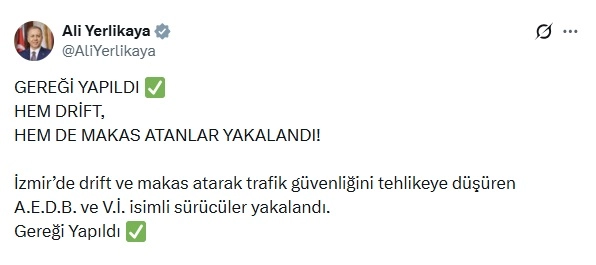 Umutcan ÖREN/ANKARA, (DHA)- İÇİŞLERİ Bakanı Ali Yerlikaya, İzmir'de drift ve makas atan 2 sürücünün yakalandığını duyurdu.
