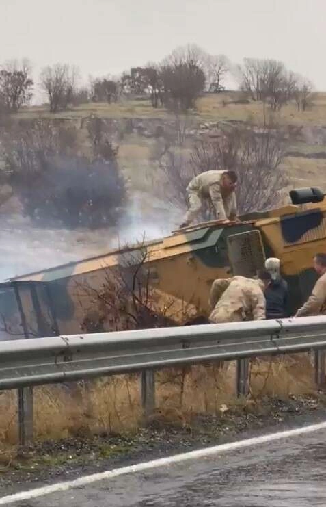 Salih KESKİN-Sekvan KÜDEN/ MİDYAT, (Mardin), (DHA)- MARDİN’in Midyat ilçesinde, yağış nedeniyle kayganlaşan yolda, sürücüsünün kontrolünden çıkıp şarampole devrilen zırhlı araçtaki 2 asker yaralandı. Kaza, Mardin-Midyat kara yolu Şenköy mevkisinde meydana geldi. Yağış nedeniyle kayganlaşan yolda, sürücüsünün kontrolünden çıkan askeri araç, şarampole yuvarlandı. İhbarla kaza yerine jandarma, itfaiye ve sağlık ekipleri sevk edildi. Yan yatan araçtaki yaralı 2 asker, ekiplerin müdahalesiyle bulundukları yerden çıkarılıp sağlık görevlilerine teslim edildi. Yaralılar, ambulanslarla Midyat Devlet Hastanesi'ne kaldırılıp tedaviye alındı. Yaralıların sağlık durumunun iyi olduğu belirtildi. (DHA) FOTOĞRAFLI