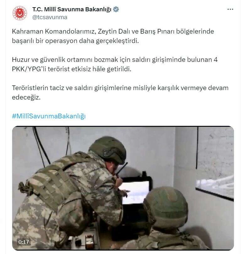 ANKARA, (DHA)- MİLLİ Savunma Bakanlığı (MSB), Zeytin Dalı ve Barış Pınarı bölgelerinde 4 PKK/YPG'li teröristin etkisiz hale getirildiğini açıkladı. Bakanlığın sosyal medya hesabından yapılan açıklamada, "Kahraman komandolarımız, Zeytin Dalı ve Barış Pınarı bölgelerinde başarılı bir operasyon daha gerçekleştirdi. Huzur ve güvenlik ortamını bozmak için saldırı girişiminde bulunan 4 PKK/YPG'li terörist etkisiz hale getirildi. Teröristlerin taciz ve saldırı girişimlerine misliyle karşılık vermeye devam edeceğiz" denildi. (DHA) FOTOĞRAFLI