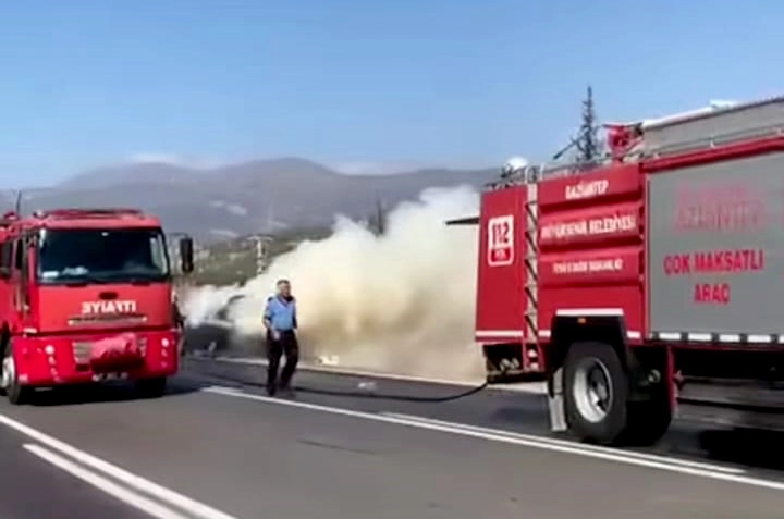 Kadir ÇELİK/NURDAĞI (Gaziantep), (DHA)- GAZİANTEP'in Nurdağı ilçesinde, seyir halindeyken motor bölümünden dumanlar yükselen otomobil, yangında kullanılmaz hale geldi.Olay, sabah saatlerinde, Nurdağı-Gaziantep yolunun 16'ncı kilometresinde meydana geldi. Suriye uyruklu Muhammed A. (55) yönetimindeki 27 MA 649 plakalı otomobilin motor bölümünden bilinmeyen nedenle dumanlar yükseldi. Durumu fark eden sürücü, otomobili emniyet şeridine çekip, dışarı çıktı. Olayı görenler, durumu 112 Acil Çağrı Merkezi'ne bildirdi. İhbarla bölgeye sevk edilen gelen itfaiye ekiplerinin müdahalesiyle alevler söndürüldü. Otomobilin kullanılmaz hale geldiği yangının çıkış nedeni araştırılıyor. (DHA)