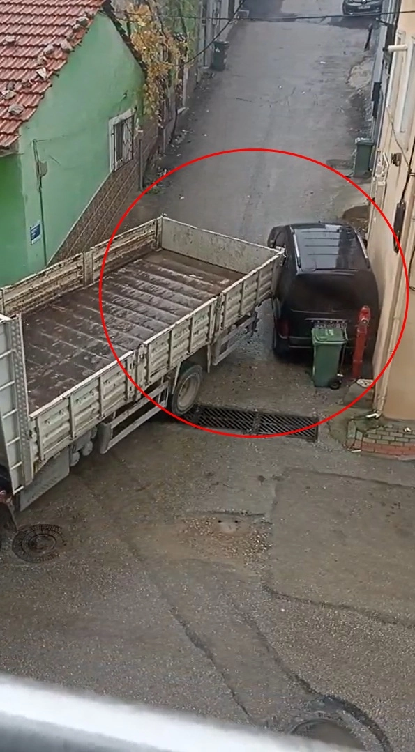 Olay, Kestel ilçesi Vani Mehmet Mahallesi’nde meydana geldi. İddiaya göre, park halindeki 33 DSG 19 plakalı hafif ticari araç nedeniyle ara sokağa dönemeyen 16 BMT 99 plakalı kamyonun şoförü, geri manevra yaparak sokağa girdi. Ardından tekrar ilerleyen ve direksiyonu sağa kıran şoförün kullandığı kamyonun kasası, park halindeki hafif ticari araca sürterek zarar verdi. Kamyon şoförü bölgeden ayrılırken, olay anı ise çevredeki bir kişi tarafından, cep telefonu kamerasıyla kaydedildi. (DHA)