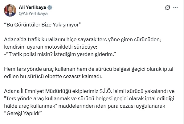 ANKARA, (DHA)- İÇİŞLERİ Bakanı Ali Yerlikaya, Adana'da ters yönde araç kullanan ve daha önce ehliyeti iptal edilen S.İ.Ö. isimli sürücünün yakalanarak idari para cezası uygulandığını duyurdu. Bakan Yerlikaya, sosyal medya hesabından yaptığı açıklamada, "Bu görüntüler bize yakışmıyor. Adana’da trafik kurallarını hiçe sayarak ters yöne giren sürücüden; kendisini uyaran motosikletli sürücüye: ‘Trafik polisi misin? İstediğim yerden giderim.’ Hem ters yönde araç kullanan hem de sürücü belgesi geçici olarak iptal edilen bu sürücü elbette cezasız kalmadı. Adana İl Emniyet Müdürlüğü ekiplerimiz S.İ.Ö. isimli sürücü yakaladı ve 'Ters yönde araç kullanmak ve sürücü belgesi geçici olarak iptal edildiği halde araç kullanmak' maddelerinden idari para cezası uygulanarak gereği yapıldı" dedi.'2024 YILINDA TERS YÖNDE ARAÇ KULLANILMASI NEDENİYLE 52 CANIMIZI KAYBETTİK'Yerlikaya, geçen yıl ters yön kullanımı nedeniyle meydana gelen kazalara değinerek, "2024 yılında ters yönde araç kullanan sürücüler nedeniyle 2 bin 836 kaza meydana geldi. Bu kazalarda maalesef 52 canımızı kaybettik. 3 bin 758 kişi de yaralandı. Trafik kazaları; sadece bireysel değil, aynı zamanda toplumsal bir sorundur. Çünkü trafik, yalnızca taşıtların akışı değil, toplumun davranışlarının, değerlerinin ve birbirine duyduğu saygının da görünür olduğu kamusal bir alandır" ifadelerini kullandı. (DHA)