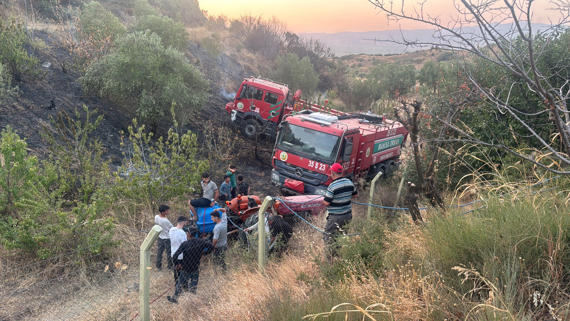 Doğan ÇİZMECİ/ TURGUTLU (Manisa), (DHA)- MANİSA’nın Turgutlu ilçesindeki makilik ve zeytinlikte çıkan yangın, ormana sıçramadan havadan ve karadan yapılan müdahaleyle söndürüldü.Turgutlu’nun kırsal Dalbahçe Mahallesi'ndeki makilik ve zeytinlik alanda bugün saat 19.20 sıralarında henüz belirlenemeyen bir nedenle alevler yükselmeye başladı. Alevleri gören vatandaşlar, durumu 112 Acil Çağrı Merkezi'ne bildirdi. Yangın, rüzgarın etkisiyle geniş alana yayıldı. İhbar üzerine İzmir Orman Bölge Müdürlüğü'ne bağlı 1 helikopter, 5 arazöz, 2 su ikmal aracı ile itfaiye ekipleri yönlendirildi. Vatandaşlar da, traktörlerinin arkasına taktıkları su tankerleriyle söndürme çalışmalarına destek verdi. Rüzgarın etkisiyle ormanlık alana doğru ilerleyen yangın, ekiplerin ve vatandaşların müdahalesiyle yaklaşık 1 saatte kontrol altına alındı. Yangında yaklaşık 10 dönüm alanda meyve bahçesi zarar gördü. Bölgede soğutma çalışmaları sürüyor. Turgutlu Kaymakamı Selami Kapankaya ve Turgutlu İlçe Emniyet Müdürü Mehmet Dursun da söndürme çalışmalarını yerinde takip etti. (DHA)