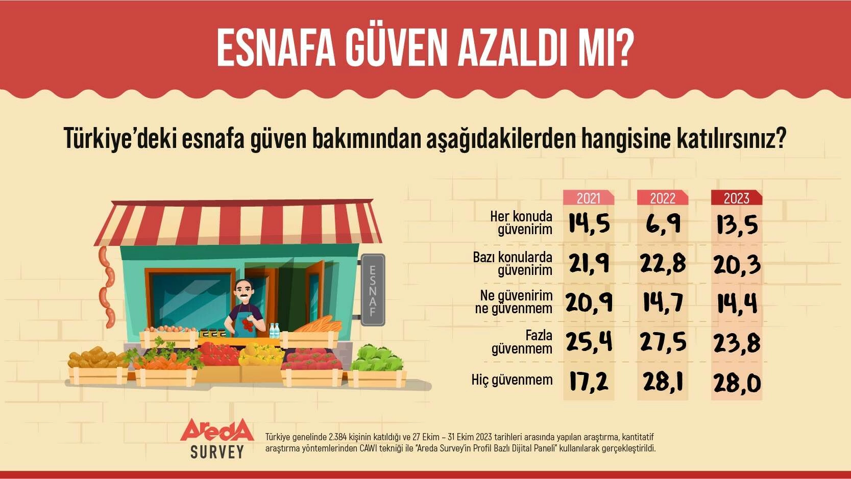 İSTANBUL, (DHA)- Araştırma şirketi Areda Survey, Türkiye genelinde 2 bin 384 kişinin katılımıyla esnaflık müessesesinin güven bakımından halktaki yansımasını araştırdı. Araştırmaya göre Türk halkının yüzde 51,8’inin esnafa güvenmediği ortaya çıktı. Areda Survey 2021 yılından itibaren her yıl gerçekleştirdiği esnafa güven araştırmasıyla Türk toplumunun değişen bakış açısını ortaya koydu. Araştırmada esnafa olan güveninin her yıl azaldığı görülse de 2023 yılında ‘Her konuda güvenirim’ diyenlerin 2022 yılına göre artış gösterdiği de dikkat çeken bir sonuç olarak yer aldı. ESNAFA HİÇ GÜVENMEYENLERİN ORANI YÜZDE 28 Areda Survey’in 2023 yılı verileri baz alındığında; Türk halkının yüzde 13,5’i esnafa ‘Her konuda güvenirim’ derken, yüzde 14,4’ü ‘Ne güvenirim ne güvenmem’ cevabını vererek daha kararsız bir tutum sergiliyor. ‘Bazı konularda güvenirim’ diyenler yüzde 20,3’lük bir kesimi kapsıyor. Esnafa güvenmediğini belirten yüzde 51,8’lik oran detaylandırıldığında; yüzde 23,8’i ‘Fazla güvenmem’, yüzde 28’i ise ‘Hiç güvenmem’ cevabını verenlerden oluşuyor. Aynı araştırmada esnafa hiç güvenmediğini söyleyenlerin yıllara göre oranları şu şekilde değişim gösteriyor; ‘Hiç güvenmem’ cevabı 2021 yılında yüzde 17,2 iken, 2022 yılında 28,1’le yükselişe geçiyor ve bu oran 2023 verilerinde de yüzde 28 ile bir önceki yıla göre benzer bir karşılık buluyor. Esnafa ‘Her konuda güvenirim’ diyenlerin yıllara göre değişimi ise; 2021’de yüzde 14,5 iken, 2022 yılında yüzde 6,9’a düşüyor. 2023 yılında ise bu oran yüzde 13,5’e çıkıyor. ARAŞTIRMANIN METODOLOJİSİ Türkiye genelinde 2 BİN 384 kişinin katıldığı ve 27 Ekim – 31 Ekim tarihleri arasında yapılan araştırma, kantitatif araştırma yöntemlerinden CAWI tekniği ile 'Areda Survey’in Profil Bazlı Dijital Paneli' kullanılarak gerçekleştirildi.