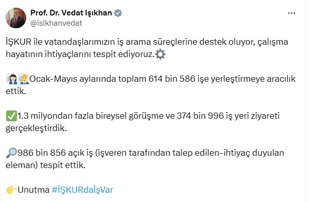 ANKARA, (DHA)- ÇALIŞMA ve Sosyal Güvenlik Bakanı Vedat Işıkhan, ocak-mayıs döneminde Türkiye İş Kurumu (İŞKUR) aracılığıyla toplam 614 bin 586 işe yerleştirmeye aracılık ettiklerini duyurdu.Bakan Vedat Işıkhan, sosyal medya hesabından yaptığı açıklamada, "İŞKUR ile vatandaşlarımızın iş arama süreçlerine destek oluyor, çalışma hayatının ihtiyaçlarını tespit ediyoruz. Ocak-mayıs aylarında toplam 614 bin 586 işe yerleştirmeye aracılık ettik. 1,3 milyondan fazla bireysel görüşme ve 374 bin 996 iş yeri ziyareti gerçekleştirdik. 986 bin 856 açık iş (işveren tarafından talep edilen-ihtiyaç duyulan eleman) tespit ettik" dedi. (DHA)