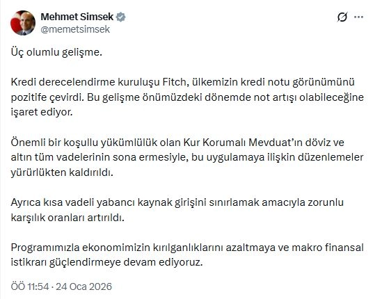 Bakan Şimşek, sanal medya hesabından yaptığı açıklamada, "Üç olumlu gelişme; kredi derecelendirme kuruluşu Fitch, ülkemizin kredi notu görünümünü pozitife çevirdi. Bu gelişme önümüzdeki dönemde not artışı olabileceğine işaret ediyor. Önemli bir koşullu yükümlülük olan Kur Korumalı Mevduat'ın döviz ve altın tüm vadelerinin sona ermesiyle, bu uygulamaya ilişkin düzenlemeler yürürlükten kaldırıldı. Ayrıca kısa vadeli yabancı kaynak girişini sınırlamak amacıyla zorunlu karşılık oranları artırıldı. Programımızla ekonomimizin kırılganlıklarını azaltmaya ve makro finansal istikrarı güçlendirmeye devam ediyoruz" ifadelerini kullandı. (DHA)