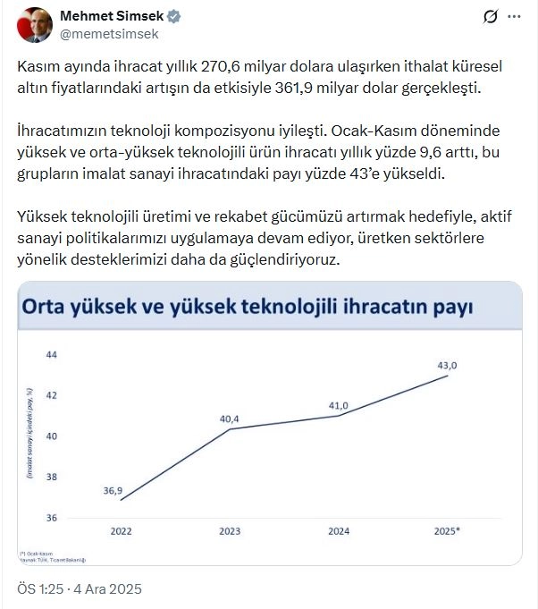 ANKARA, (DHA)- HAZİNE ve Maliye Bakanı Mehmet Şimşek, "İhracatımızın teknoloji kompozisyonu iyileşti. Ocak-kasım döneminde yüksek ve orta-yüksek teknolojili ürün ihracatı yıllık yüzde 9,6 arttı, bu grupların imalat sanayi ihracatındaki payı yüzde 43'e yükseldi" dedi.