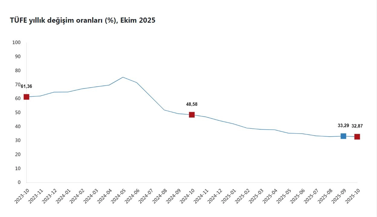 TÜİK, Ekim 2025 dönemine ilişkin enflasyon verilerini açıkladı. Buna göre; tüketici fiyatları 2025 yılı Ekim ayında bir önceki aya göre yüzde 2,55, bir önceki yılın aralık ayına göre yüzde 28,63, bir önceki yılın aynı ayına göre yüzde 32,87 ve 12 aylık ortalamalara göre yüzde 37,15 arttı.