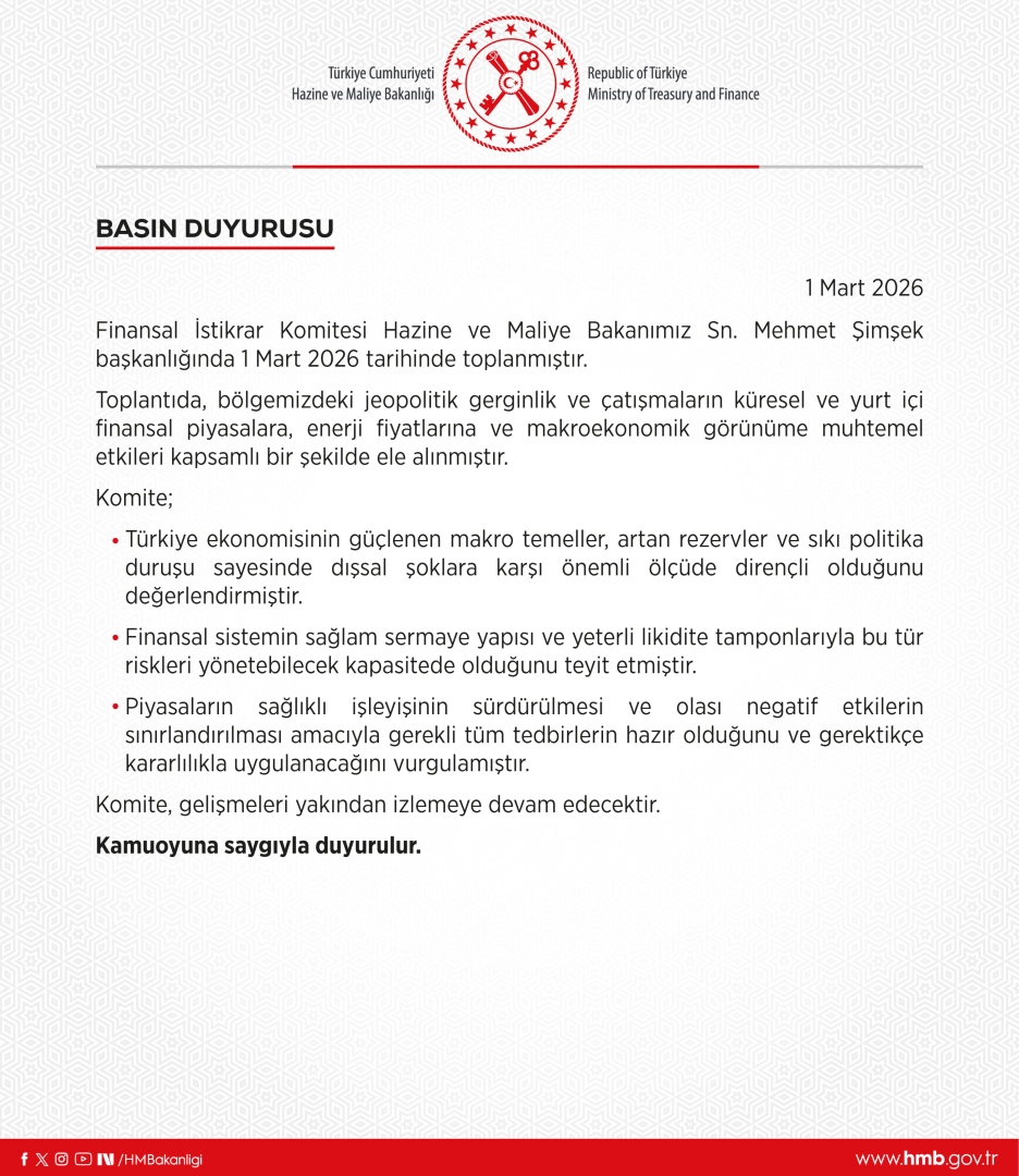 Hazine ve Maliye Bakanı Mehmet Şimşek başkanlığında toplanan toplantıya ilişkin yapılan açıklamada, toplantıda, bölgedeki jeopolitik gerilim ve çatışmaların küresel ve yurt içi finansal piyasalara, enerji fiyatlarına ve makroekonomik görünüme muhtemel etkilerinin kapsamlı bir şekilde ele alındığı belirtildi. Açıklamada, "Komite, Türkiye ekonomisinin güçlenen makro temelleri, artan rezervler ve sıkı politika duruşu sayesinde dışsal şoklara karşı önemli ölçüde dirençli olduğunu değerlendirmiştir. Finansal sistemin sağlam sermaye yapısı ve yeterli likidite tamponlarıyla bu tür riskleri yönetebilecek kapasitede olduğunu teyit etmiştir. Piyasaların sağlıklı işleyişinin sürdürülmesi ve olası negatif etkilerin sınırlandırılması amacıyla gerekli tüm tedbirlerin hazır olduğunu ve gerektiğinde kararlılıkla uygulanacağını vurgulamıştır. Komite, gelişmeleri yakından izlemeye devam edecektir" ifadelerine yer verildi. (DHA)