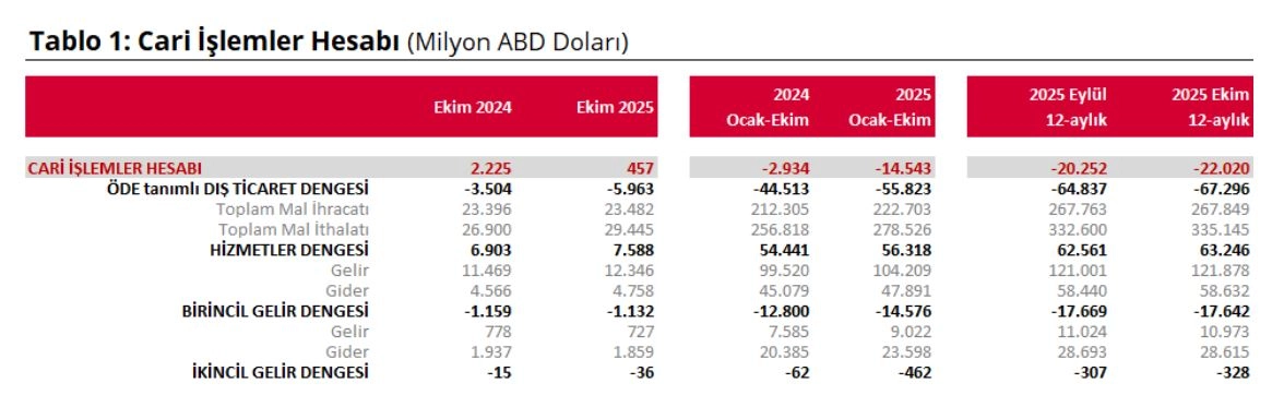 TCMB, Ekim 2025 dönemine ilişkin ödemeler dengesi istatistiklerini açıkladı. Buna göre; ekim ayında cari işlemler hesabı 457 milyon dolar fazla kaydetti. Altın ve enerji hariç cari işlemler hesabı ise 7 milyar 28 milyon dolar fazla verdi. Ödemeler dengesi tanımlı dış ticaret açığı 5 milyar 963 milyon dolar olarak gerçekleşti. Yıllıklandırılmış verilere göre, ekim ayında cari açık yaklaşık 22 milyar dolar olurken, ödemeler dengesi tanımlı dış ticaret dengesi de 67,3 milyar dolar açık verdi. Aynı dönemde hizmetler dengesi 63,2 milyar dolar fazla verirken, birincil ve ikincil gelir dengesi sırasıyla 17,6 milyar dolar ve 328 milyon dolar açık verdi. Hizmetler dengesi kaynaklı net girişler bu ay 7 milyar 588 milyon dolar seviyesinde gerçekleşti. Bu kalem altında taşımacılık hizmetleri ve seyahat kaleminden kaynaklanan net gelirler sırasıyla 2 milyar 462 milyon dolar ve 5 milyar 860 milyon dolar oldu.