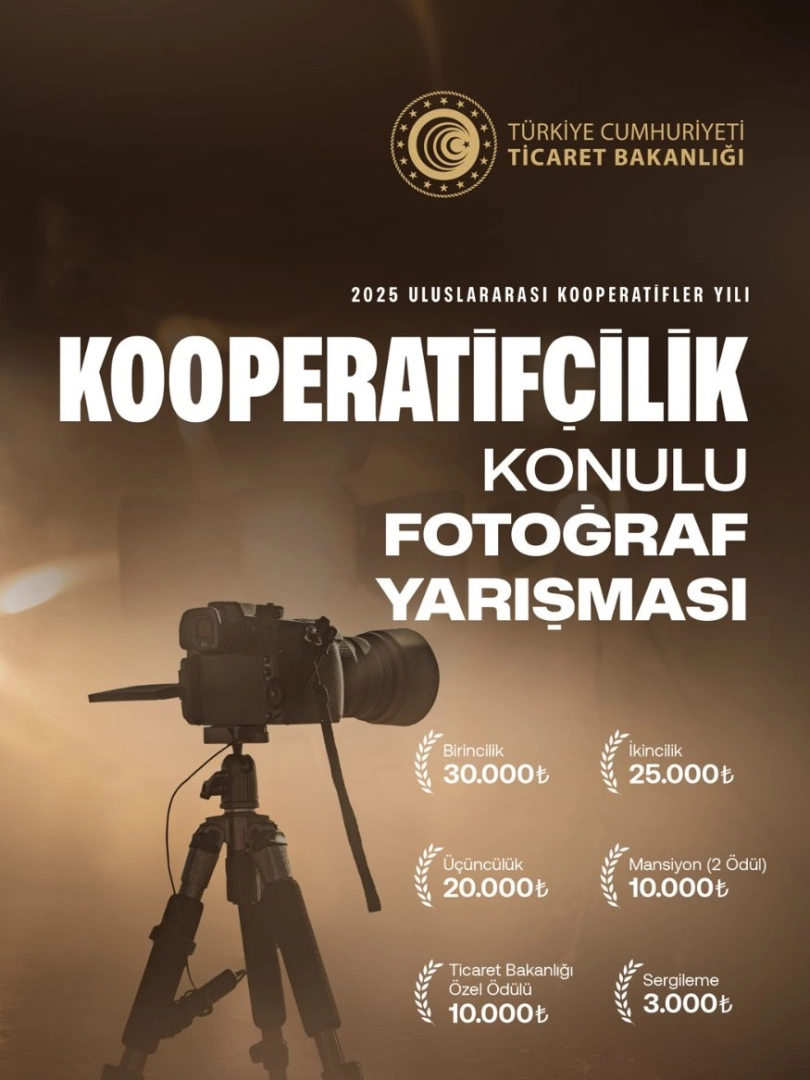 ANKARA, (DHA)- TİCARET Bakanlığı, 'Kooperatifçilik' konulu fotoğraf yarışması düzenleneceğini duyurdu. Bakanlığın, sosyal medya hesabından yapılan açıklamada, "2025 yılının Birleşmiş Milletler tarafından Uluslararası Kooperatifler Yılı ilan edilmesi vesilesiyle; Kooperatifçilik kültürümüzü geleceğe taşımak, dayanışma ve iş birliği ruhunu yaygınlaştırmak amacıyla 18 yaş ve üzeri tüm amatör ve profesyonel fotoğrafçılara açık 'Kooperatifçilik' konulu fotoğraf yarışması düzenliyoruz. Son başvuru tarihi: 13 Temmuz 2025" ifadelerine yer verdi.BİRİNCİLİK ÖDÜLÜ 30 BİN LİRAFotoğraf yarışmasında birincilik ödülünün 30 bin TL, ikincilik ödülünün 25 bin TL, üçüncülük ödülünün ise 20 bin TL olarak belirlendiği aktarıldı. Derecelerin yanı sıra, 2 adet 10 bin TL değerinde mansiyon ödülü, 10 bin TL değerinde Ticaret Bakanlığı özel ödülü ve 3 bin TL değerinde sergileme ödülü verileceği açıklandı. Adaylar, başvuru formu ve detaylara Ticaret Bakanlığı resmi web sitesinden ulaşabilecek. (DHA)