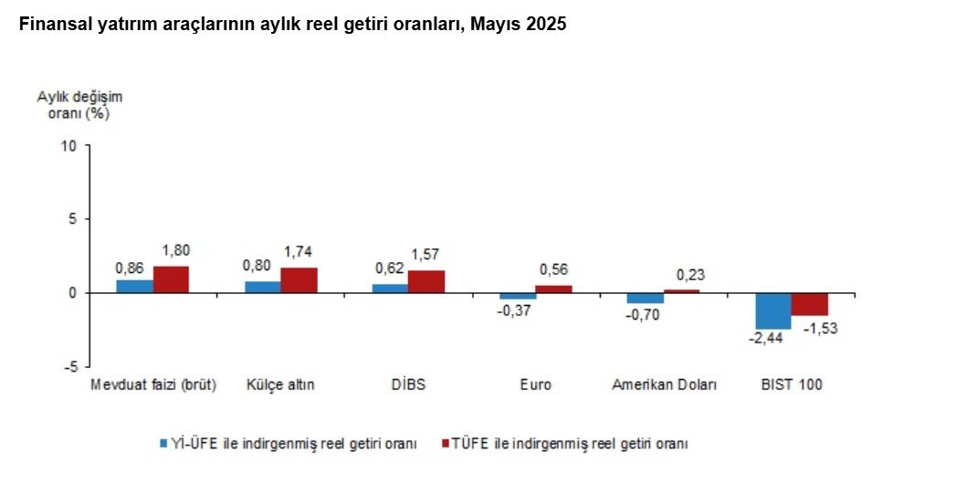 Aybala MELEK/ANKARA, (DHA)- TÜRKİYE İstatistik Kurumu (TÜİK), mayıs ayında aylık en yüksek reel getirinin mevduat faizinde olduğunu açıkladı.TÜİK, Mayıs 2025 dönemine ilişkin finansal yatırım araçlarının reel getiri oranlarını açıkladı. Buna göre; aylık en yüksek reel getiri, yurt içi üretici fiyat endeksi (Yİ-ÜFE) ile indirgendiğinde yüzde 0,86, tüketici fiyat endeksi (TÜFE) ile indirgendiğinde yüzde 1,80 oranlarıyla mevduat faizinde gerçekleşti. Yİ-ÜFE ile indirgendiğinde yatırım araçlarından külçe altın yüzde 0,80 ve Devlet İç Borçlanma Senetleri (DİBS) yüzde 0,62 oranlarında yatırımcısına reel getiri sağlarken; avro yüzde 0,37, dolar yüzde 0,70 ve BIST 100 endeksi yüzde 2,44 oranlarında yatırımcısına kaybettirdi. TÜFE ile indirgendiğinde külçe altın yüzde 1,74, DİBS yüzde 1,57, avro yüzde 0,56 ve dolar yüzde 0,23 oranlarında yatırımcısına reel getiri sağlarken; BIST 100 endeksi yüzde 1,53 oranında yatırımcısına kaybettirdi.3 VE 6 AYLIK DEĞERLENDİRMEKülçe altın, üç aylık değerlendirmede; Yİ-ÜFE ile indirgendiğinde yüzde 12,83, TÜFE ile indirgendiğinde yüzde 13 oranlarında yatırımcısına en yüksek reel getiri sağlayan yatırım aracı oldu. Aynı dönemde BIST 100 endeksi, Yİ-ÜFE ile indirgendiğinde yüzde 10,68, TÜFE ile indirgendiğinde yüzde 10,55 oranlarında yatırımcısına en çok kaybettiren yatırım aracı oldu.Altı aylık değerlendirmeye göre külçe altın; Yİ-ÜFE ile indirgendiğinde yüzde 19,84, TÜFE ile indirgendiğinde ise yüzde 16,85 oranlarında yatırımcısına en yüksek reel getiri sağlayan yatırım aracı olurken; aynı dönemde BIST 100 endeksi, Yİ-ÜFE ile indirgendiğinde yüzde 10,91, TÜFE ile indirgendiğinde ise yüzde 13,13 oranlarında yatırımcısına en çok kaybettiren yatırım aracı oldu.YILLIK EN YÜKSEK GETİRİ KÜLÇE ALTINDAFinansal yatırım araçları yıllık olarak değerlendirildiğinde külçe altın; Yİ-ÜFE ile indirgendiğinde yüzde 37,32, TÜFE ile indirgendiğinde yüzde 24,87 oranlarında yatırımcısına en yüksek reel getiri sağlayan yatırım aracı oldu. Yıllık değerlendirmede, Yİ-ÜFE ile indirgendiğinde; yatırım araçlarından mevduat faizi yüzde 16,38 ve avro yüzde 1,98 oranlarında yatırımcısına reel getiri sağlarken; DİBS yüzde 0,68, dolar yüzde 2,28 ve BIST 100 endeksi yüzde 27,26 oranlarında yatırımcısına kaybettirdi. TÜFE ile indirgendiğinde mevduat faizi yüzde 5,83 oranında yatırımcısına reel getiri sağlarken; avro yüzde 7,27, DİBS yüzde 9,69, dolar yüzde 11,14 ve BIST 100 endeksi yüzde 33,85 oranlarında yatırımcısına kaybettirdi. (DHA)