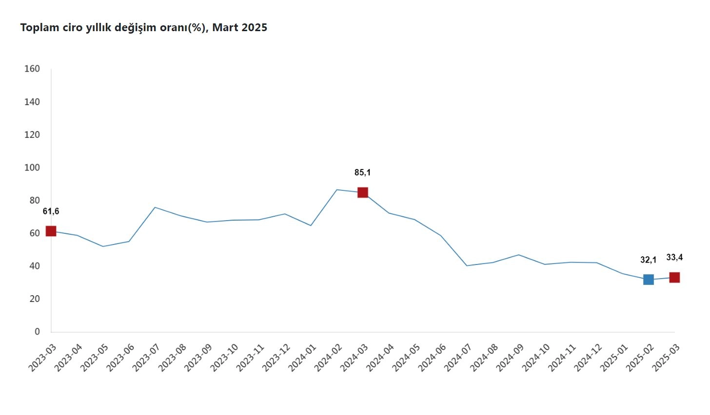 ANKARA, (DHA)- TÜRKİYE İstatistik Kurumu (TÜİK), mart ayında sanayi, inşaat, ticaret ve hizmet sektörlerinde toplam cironun yıllık yüzde 33,4, aylık yüzde 4,2 arttığını açıkladı.TÜİK, Mart 2025 dönemine ilişkin ciro ve ticaret satış hacim endekslerini açıkladı. Buna göre; sanayi, inşaat, ticaret ve hizmet sektörleri toplamında ciro endeksi yıllık yüzde 33,4 arttı. Toplam cironun alt detaylarına bakıldığında; yıllık sanayi sektörü ciro endeksi yüzde 25, inşaat ciro endeksi yüzde 26,3, ticaret ciro endeksi yüzde 37,8, hizmet ciro endeksi yüzde 35,9 arttı.Sanayi, inşaat, ticaret ve hizmet sektörleri toplamında ciro endeksi, aylık yüzde 4,2 arttı. Toplam cironun alt detaylarına bakıldığında; aylık sanayi sektörü ciro endeksi yüzde 5,5, inşaat ciro endeksi yüzde 4,6, ticaret ciro endeksi yüzde 5,8, hizmet ciro endeksi yüzde 0,5 arttı.TİCARET SATIŞ HACMİ YILLIK YÜZDE 10,8 ARTTITicaret satış hacmi de mart ayında, bir önceki yılın aynı ayına göre yüzde 10,8 arttı. Aynı ayda motorlu kara taşıtlarının ve motosikletlerin toptan ve perakende ticareti ile onarımı için satış hacmi yüzde 12,8, toptan ticaret satış hacmi yüzde 11,1, perakende ticaret satış hacmi ise yüzde 9,2 arttı.Ticaret satış hacmi bir önceki aya göre de yüzde 5 arttı. Aynı ayda motorlu kara taşıtlarının ve motosikletlerin toptan ve perakende ticareti ile onarımı için satış hacmi yüzde 3,6, toptan ticaret satış hacmi yüzde 8,1 arttı; perakende ticaret satış hacmi ise yüzde 1,4 azaldı. (DHA)