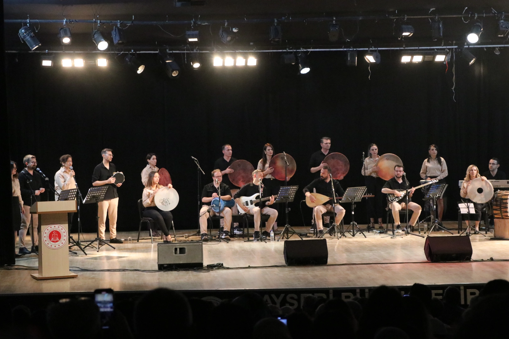 Samed Aydın SUN/ KAYSERİ, (DHA)- KAYSERi Adliyesi'nde çalışan; aralarında yazı işleri müdürü, zabıt katibi, mübaşir, avukat ve infaz koruma memurlarının olduğu 21 kişi bir araya gelerek, Türkiye'nin ilk adliye ritim topluluğunu oluşturdu. Bugüne kadar hiçbir müzik ve ritim bilgisi olmayan kişilerden oluşan grup, ikinci büyük konserini kent protokolüne verdi. Konserde, Cumhuriyet Başsavcısı Habib Korkmaz da ‘Bir Ay Doğar’ parçasını seslendirdi.Kayseri Adliyesi'nde çalışan; aralarında yazı işleri müdürü, zabıt katibi ve mübaşirlerin olduğu kişiler bir araya gelerek Resen Ritim Topluluğu isimli bir grup kurdu. Sosyal medyada grubun videolarını paylaşması sonrası topluluğa avukat ve infaz koruma memurları da katıldı. 21 kişiden oluşan ve Türkiye'nin ilk adliye ritim topluluğu olma özelliği taşıyan grup, mesai saatleri dışında adliye konferans salonunda çalışmalar yaparak, 10 ayda konser verebilecek düzeye erişti. Topluluk, bugün kentteki 1500 kapasiteli Kadir Has ve Kültür Merkezi’nde ikinci büyük konserini kent protokolüne verdi.Konsere Vali Yardımcısı Ömer Tekeş, 2’nci Hava Bakım Fabrika Müdürü Tuğgeneral Volkan Ersun Acar, Kayseri Cumhuriyet Başsavcısı Habib Korkmaz, Adalet Komisyonu Başkanı Hacı Mustafa Yazıcı, İl Jandarma Komutanı Tuğgeneral Hakan Dedebağı, İl Emniyet Müdürü Atanur Aydın ve Başsavcı vekilleri Tuncay Yılmaz, Ahmet Yılmaz, Ogün Köse, Müstakim Türkyılmaz ile hakim ve savcılar ile çok sayıda adliye personeli katıldı.‘ÇOK EĞLENİYORUZ’Grup üyelerinden Avukat Neşe Nasırlıoğlu, “1.5 yıldır çeşitli ritim aletlerini bu toplulukta çalıyorum. Adliye çalışanlarının oluşturduğu bir gruba dışarıdan dahil olduk. Bugün 6’ncı konserimizi veriyoruz. Çalışmalarda çok eğleniyoruz. İşimiz çok stresli bir iş. Yoğun iş stresini mesai sonrası müzik ve ritim ile atıyoruz” diye konuştu. İnfaz koruma memuru Ömer Faruk Kevenci ise “Müzik bilgim olmamasına rağmen bir anda kendimi müziğin doğasına kaptırdım. Grup o kadar eğlenceli ki mesaiden sonra koşarak gelmeye başladım. Şu an çok iyi kademelere geldiğimizi düşünüyorum” dedi.Konser boyunca, ritim topluluğu birçok eseri seslendirirken, Kayseri Cumhuriyet Başsavcısı Habib Korkmaz da ‘Bir Ay Doğar İlk Akşamdan Geceden’ parçasını söyledi. Başsavcı Korkmaz’ın yorumu salondakiler tarafından beğeni aldı. Konser, topluluk üyelerine çiçek takdimi ve hatıra fotoğrafı çekimi ile sona erdi. (DHA)