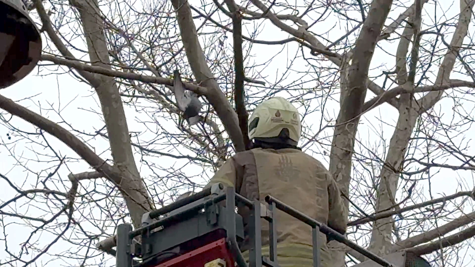 Olay, Merkez Mahallesi Atatürk Parkı’nda meydana geldi. Ağaçta güvercinin ayağına ip dolandığını ve çırpındığını görenler, durumu 112 Acil Çağrı Merkezi’ne bildirdi. İhbar üzerine olay yerine itfaiye ekipleri sevk edildi. Sepetli araçla ağaca çıkan itfaiye erlerinden biri, mahsur kalan güvercine ulaşarak bir eliyle hayvanı tuttu, diğer eliyle de ayağına dolanan ipi kesti. Kurtarılan güvercin daha sonra serbest bırakıldı. (DHA)