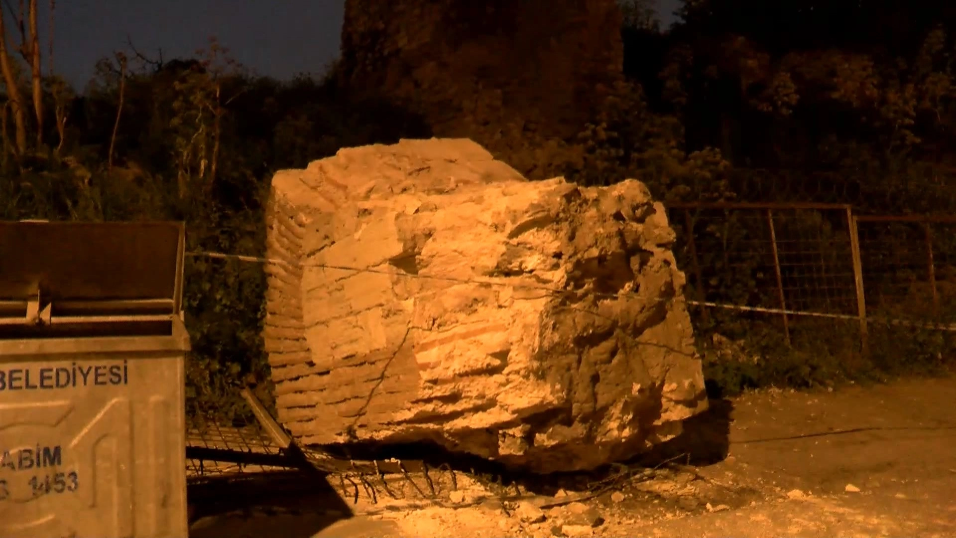 Baran AKKAYA/İSTANBUL,(DHA) - SİLİVRİ açıklarında meydana gelen depremin ardından Fatih Surları'ndan kopan bir parça yola düştü. Taş parça, belediye ekipleri tarafından yol kenarına alındı. Silivri açıklarında saat 12.49'da meydana gelen 6,2 büyüklüğündeki deprem sonrasında, İstanbul'un tarihi surlarından olan Fatih Surları’ndan kopan büyük bir parça, Sulukule Caddesi üzerine düştü. Çevredekilerin ihbarı üzerine olay yerine belediye ekipleri geldi. Ekipler, surlardan kopan yaklaşık 2 metre yüksekliğindeki parçayı vinç ile yol kenarına aldı. (DHA)
