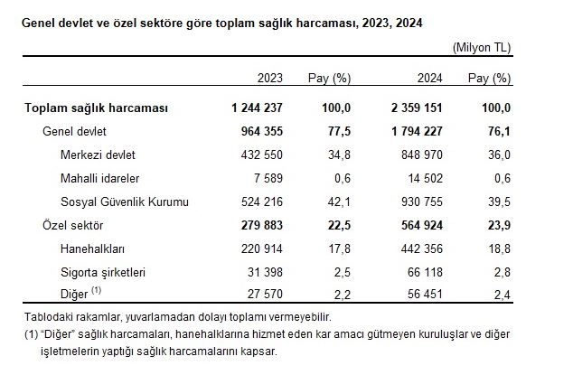 Genel devlet sağlık harcamasının toplam sağlık harcamasına oranı 2024 yılında yüzde 76,1, özel sektör sağlık harcamasının oranı ise yüzde 23,9 olarak gerçekleşti. Genel devlet ve özel sektörün alt bileşenlerine bakıldığında, 2024 yılında Sosyal Güvenlik Kurumu yüzde 39,5, merkezi devlet yüzde 36, hanehalkları yüzde 18,8, sigorta şirketleri yüzde 2,8, hanehalklarına hizmet eden kar amacı gütmeyen kuruluşlar ile diğer işletmeler yüzde 2,4, mahalli idareler yüzde 0,6'lık bir paya sahip oldu.