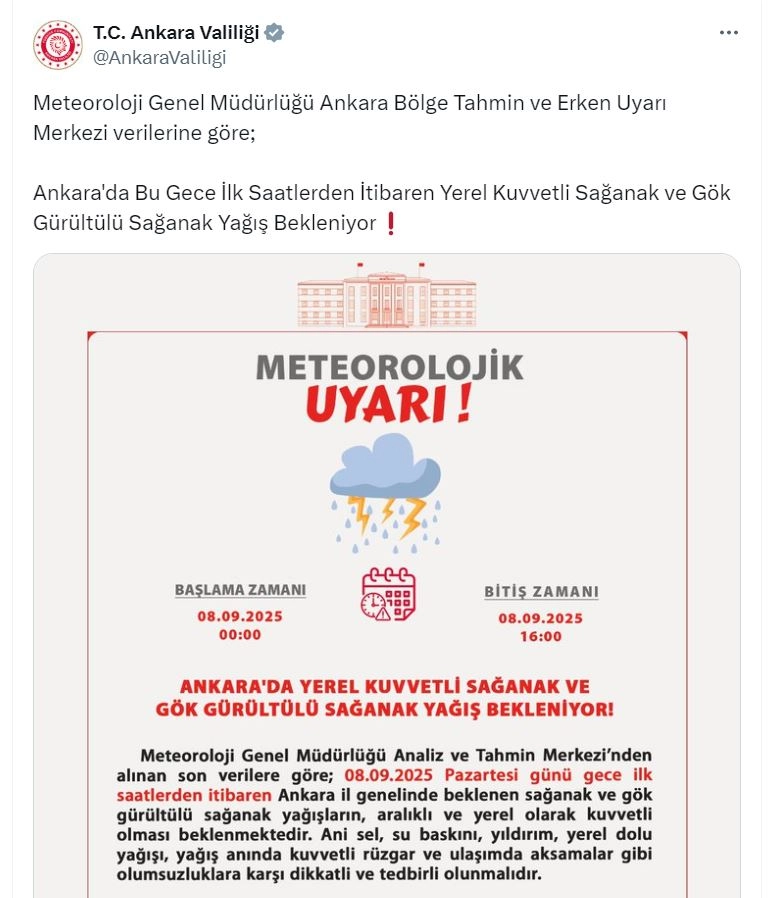 ANKARA, (DHA)- ANKARA Valiliği, bugün gece saatlerinden itibaren kentte etkili olması beklenen gök gürültülü sağanak nedeniyle sel ve su baskınlarına karşı uyardı.Valiliğin sosyal medya hesabından yapılan açıklamada, "Meteoroloji Genel Müdürlüğü Analiz ve Tahmin Merkezi'nden alınan son verilere göre; 8 Eylül 2025 Pazartesi günü gece ilk saatlerden itibaren Ankara il genelinde beklenen sağanak ve gök gürültülü sağanak yağışların, aralıklı ve yerel olarak kuvvetli olması beklenmektedir. Ani sel, su baskını, yıldırım, yerel dolu yağışı, yağış anında kuvvetli rüzgar ve ulaşımda aksamalar gibi olumsuzluklara karşı dikkatli ve tedbirli olunmalıdır" denildi. (DHA)