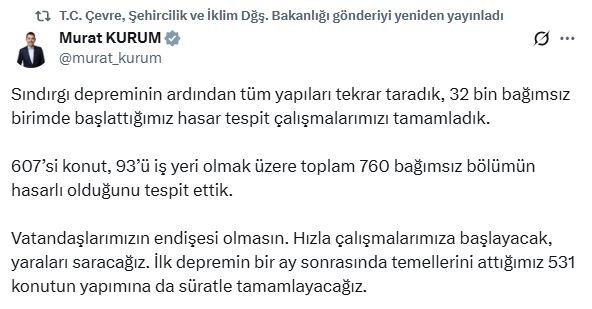 ANKARA, (DHA)- ÇEVRE, Şehircilik ve İklim Değişikliği Bakanı Murat Kurum, "Sındırgı depreminin ardından tüm yapıları tekrar taradık, 32 bin bağımsız birimde başlattığımız hasar tespit çalışmalarımızı tamamladık. Toplam 760 bağımsız bölümün hasarlı olduğunu tespit ettik" dedi.