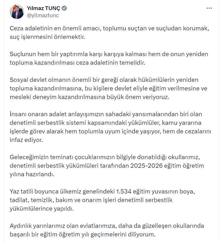 ANKARA, (DHA)- ADALET Bakanı Yılmaz Tunç, "Okullarımız, denetimli serbestlik yükümlüleri tarafından 2025-2026 eğitim öğretim yılına hazırlandı. Yaz tatili boyunca 1534 eğitim yuvasının boya, tadilat, temizlik, bakım ve onarım işleri denetimli serbestlik yükümlülerince yapıldı" dedi.Bakan Yılmaz Tunç, sosyal medya hesabından yaptığı açıklamada, "Ceza adaletinin en önemli amacı, toplumu suçtan ve suçludan korumak, suç işlenmesini önlemektir. Suçlunun hem bir yaptırımla karşı karşıya kalması hem de onun yeniden topluma kazandırılması ceza adaletinin temelidir. Sosyal devlet olmanın önemli bir gereği olarak hükümlülerin yeniden topluma kazandırılmasına, bu kişilere devlet eliyle eğitim verilmesine ve mesleki deneyim kazandırılmasına büyük önem veriyoruz. İnsanı onaran adalet anlayışımızın sahadaki yansımalarından biri olan denetimli serbestlik sistemi kapsamındaki yükümlüler, kamu yararına işlerde görev alarak hem toplumla uyum içinde yaşıyor, hem de cezalarını infaz ediyor" ifadelerini kullandı.Bakan Tunç, "Geleceğimizin teminatı çocuklarımızın bilgiyle donatıldığı okullarımız, denetimli serbestlik yükümlüleri tarafından 2025-2026 eğitim öğretim yılına hazırlandı. Yaz tatili boyunca ülkemiz genelindeki 1534 eğitim yuvasının boya, tadilat, temizlik, bakım ve onarım işleri denetimli serbestlik yükümlülerince yapıldı. Aydınlık yarınlarımız olan evlatlarımıza, daha da güzelleşen okullarında başarılı bir eğitim öğretim yılı geçirmelerini diliyorum" dedi. (DHA)