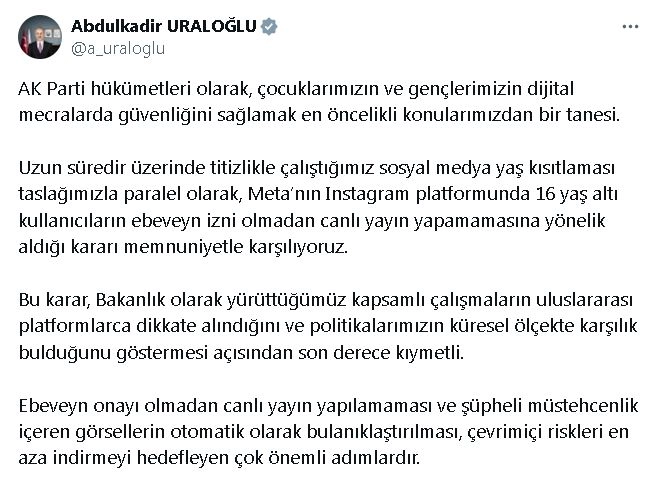 ANKARA, (DHA)- ULAŞTIRMA ve Altyapı Bakanı Abdulkadir Uraloğlu, "Uzun süredir üzerinde titizlikle çalıştığımız sosyal medya yaş kısıtlaması taslağımızla paralel olarak, Meta'nın Instagram platformunda 16 yaş altı kullanıcıların ebeveyn izni olmadan canlı yayın yapamamasına yönelik aldığı kararı memnuniyetle karşılıyoruz" dedi.Ulaştırma ve Altyapı Bakanı Abdulkadir Uraloğlu, sosyal medya hesabından yaptığı açıklamada, "AK Parti hükümetleri olarak, çocuklarımızın ve gençlerimizin dijital mecralarda güvenliğini sağlamak en öncelikli konularımızdan bir tanesi. Uzun süredir üzerinde titizlikle çalıştığımız sosyal medya yaş kısıtlaması taslağımızla paralel olarak, Meta'nın Instagram platformunda 16 yaş altı kullanıcıların ebeveyn izni olmadan canlı yayın yapamamasına yönelik aldığı kararı memnuniyetle karşılıyoruz. Bu karar, bakanlık olarak yürüttüğümüz kapsamlı çalışmaların uluslararası platformlarca dikkate alındığını ve politikalarımızın küresel ölçekte karşılık bulduğunu göstermesi açısından son derece kıymetli. Ebeveyn onayı olmadan canlı yayın yapılamaması ve şüpheli müstehcenlik içeren görsellerin otomatik olarak bulanıklaştırılması, çevrim içi riskleri en aza indirmeyi hedefleyen çok önemli adımlardır" ifadelerini kullandı.'Türkiye Yüzyılı' vizyonuyla çocukların dijital alanda güçlü, özgür ama aynı zamanda güvenli bir şekilde var olabilmeleri için tüm imkanlarını seferber ettiklerini belirten Uraloğlu, "Ulusal düzeyde koruyucu dijital politikalar üretmeye ve küresel teknoloji devleriyle iş birliği içinde hareket etmeye devam edeceğiz. Bu alandaki kararlılığımız sayesinde sadece Türkiye'de değil, dünyada da standartları belirleyen bir ülke olma yolunda emin adımlarla ilerliyoruz" dedi. (DHA)