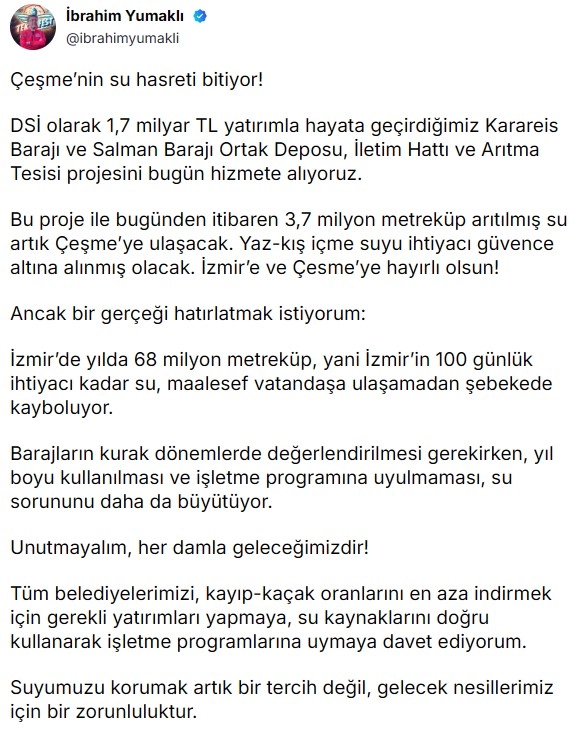 ANKARA, (DHA)-TARIM ve Orman Bakanı İbrahim Yumaklı, "Çeşme'nin su hasreti bitiyor. Bugünden itibaren 3,7 milyon metreküp arıtılmış su artık Çeşme'ye ulaşacak. Yaz-kış içme suyu ihtiyacı güvence altına alınmış olacak" dedi. Bakan Yumaklı, sosyal medya hesabından Karareis Barajı ve Salman Barajı Ortak Deposu, İletim Hattı ve Arıtma Tesisi projesinin bugün hizmete alınacağını duyurdu. Yumaklı, "Çeşme'nin su hasreti bitiyor. DSİ olarak 1,7 milyar TL yatırımla hayata geçirdiğimiz Karareis Barajı ve Salman Barajı Ortak Deposu, İletim Hattı ve Arıtma Tesisi projesini bugün hizmete alıyoruz. Bu proje ile bugünden itibaren 3,7 milyon metreküp arıtılmış su artık Çeşme'ye ulaşacak. Yaz-kış içme suyu ihtiyacı güvence altına alınmış olacak. İzmir’e ve Çeşme'ye hayırlı olsun" dedi.‘SUYUMUZU KORUMAK ZORUNLULUKTUR’Yumaklı ayrıca "İzmir'de yılda 68 milyon metreküp, yani İzmir’in 100 günlük ihtiyacı kadar su, maalesef vatandaşa ulaşamadan şebekede kayboluyor. Barajların kurak dönemlerde değerlendirilmesi gerekirken, yıl boyu kullanılması ve işletme programına uyulmaması, su sorununu daha da büyütüyor. Unutmayalım, her damla geleceğimizdir. Tüm belediyelerimizi, kayıp-kaçak oranlarını en aza indirmek için gerekli yatırımları yapmaya, su kaynaklarını doğru kullanarak işletme programlarına uymaya davet ediyorum. Suyumuzu korumak artık bir tercih değil, gelecek nesillerimiz için bir zorunluluktur" açıklamasında bulundu. (DHA)
