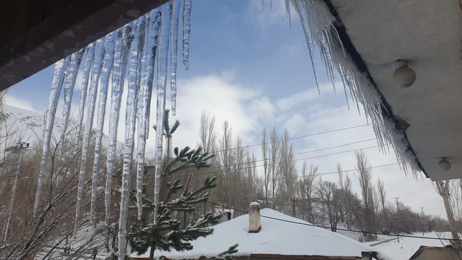 Harun AKSU/BAŞKALE,(Van), (DHA)- VAN'ın Başkale ilçesinde kar yağışı sonrası geceleri hava sıcaklığı eksi 5 dereceye kadar düştü, bina ve tek katlı evlerin çatılarında uzun buz sarkıtları oluştu.Türkiye'de 2 bin 400 rakımıyla en yüksek yerleşim yerlerinden olan Van'ın Başkale ilçesine, 2 gün önce kar yağdı. Yağış sonrası ilçede etkili olan dondurucu soğuklar nedeniyle hava sıcaklığı geceleri sıfırın altında 5 dereceye kadar düştü. Soğuk havada bina ve tek katlı evlerin çatılarında buz sarkıtlarının oluştuğu görüldü. (DHA)
