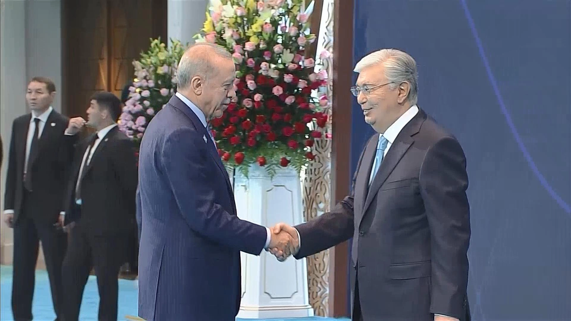 KAZAKİSTAN, (DHA)- Cumhurbaşkanı Recep Tayyip Erdoğan, Astana’da düzenlenecek Şanghay İşbirliği Örgütü 24'üncü Devlet Başkanları Zirvesi öncesinde Kazakistan Cumhurbaşkanı Kasım Cömert Tokayev tarafından karşılandı.Görüntü Dökümü--------------------------Erdoğan’ın zirvenin yapılacağı binaya gelişi-Tokayev tarafından karşılama-Detaylar