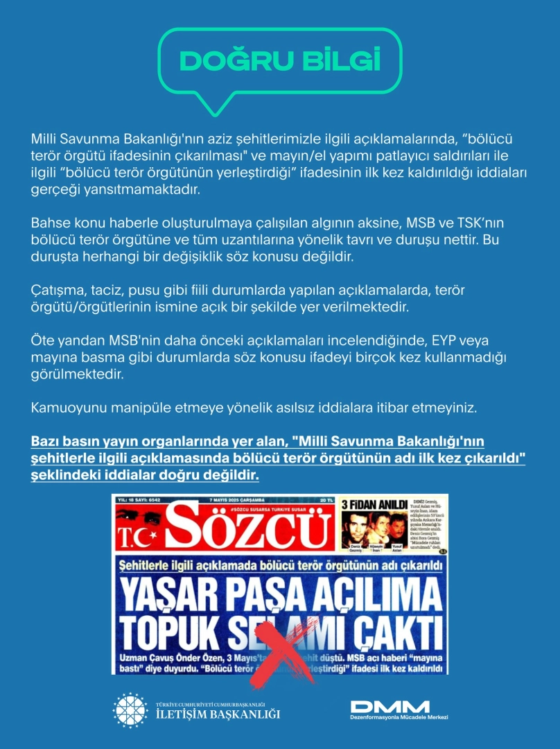 ANKARA, (DHA)- CUMHURBAŞKANLIĞI İletişim Başkanlığı Dezenformasyonla Mücadele Merkezi (DMM), "Bazı basın yayın organlarında yer alan, 'Milli Savunma Bakanlığı'nın (MSB) şehitlerle ilgili açıklamasında bölücü terör örgütünün adı ilk kez çıkarıldı' şeklindeki iddialar doğru değildir" açıklamasında bulundu.DMM’nin sosyal medya hesabından yapılan açıklamada, "Bazı basın yayın organlarında yer alan, 'Milli Savunma Bakanlığı'nın şehitlerle ilgili açıklamasında bölücü terör örgütünün adı ilk kez çıkarıldı' şeklindeki iddialar doğru değildir. Milli Savunma Bakanlığı'nın aziz şehitlerimizle ilgili açıklamalarında, 'bölücü terör örgütü ifadesinin çıkarılması' ve mayın/el yapımı patlayıcı saldırıları ile ilgili 'bölücü terör örgütünün yerleştirdiği' ifadesinin ilk kez kaldırıldığı iddiaları gerçeği yansıtmamaktadır. Bahse konu haberle oluşturulmaya çalışılan algının aksine, MSB ve TSK'nın bölücü terör örgütüne ve tüm uzantılarına yönelik tavrı ve duruşu nettir. Bu duruşta herhangi bir değişiklik söz konusu değildir. Çatışma, taciz, pusu gibi fiili durumlarda yapılan açıklamalarda, terör örgütü/örgütlerinin ismine açık bir şekilde yer verilmektedir. Öte yandan MSB'nin daha önceki açıklamaları incelendiğinde, EYP veya mayına basma gibi durumlarda söz konusu ifadeyi birçok kez kullanmadığı görülmektedir. Kamuoyunu manipüle etmeye yönelik asılsız iddialara itibar etmeyiniz" ifadelerine yer verildi. (DHA)