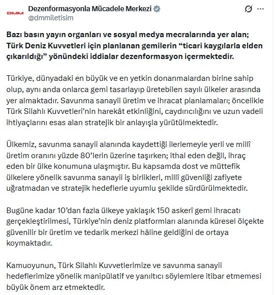ANKARA, (DHA)- İLETİŞİM Başkanlığı Dezenformasyonla Mücadele Merkezi (DMM), "Türk Deniz Kuvvetleri için planlanan gemilerin ticari kaygılarla elden çıkarıldığı yönündeki iddialar dezenformasyon içermektedir" açıklamasını yaptı.