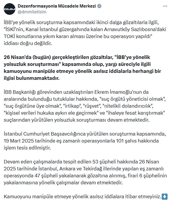 ANKARA, (DHA)- İLETİŞİM Başkanlığı Dezenformasyonla Mücadele Merkezi (DMM), İstanbul Büyükşehir Belediyesi'ne (İBB) yönelik bugün gerçekleştirilen gözaltılara ilişkin açıklama yaptı.DMM'nin sosyal medya hesabından, İBB'ye yönelik bugün gerçekleştirilen gözaltılara ilişkin açıklama yapıldı. Açıklamada, şu ifadelere yer verildi:"İBB'ye yönelik soruşturma kapsamındaki ikinci dalga gözaltılarla ilgili, 'İSKİ'nin (İstanbul Su ve Kanalizasyon İdaresi), Kanal İstanbul güzergahında kalan Arnavutköy Sazlıbosna'daki TOKİ (Toplu Konut İdaresi) konutlarına yıkım kararı alması üzerine bu operasyon yapıldı' iddiası doğru değildir. 26 Nisan'da gerçekleştirilen gözaltılar, 'İBB'ye yönelik yolsuzluk soruşturması' kapsamında olup, yargı süreciyle ilgili kamuoyunu manipüle etmeye yönelik asılsız iddialarla herhangi bir ilgisi bulunmamaktadır. İBB Başkanlığı görevinden uzaklaştırılan Ekrem İmamoğlu'nun da aralarında bulunduğu tutuklular hakkında, 'Suç örgütü yöneticisi olmak', 'Suç örgütüne üye olmak', 'İrtikap', 'Rüşvet', 'Nitelikli dolandırıcılık', 'Kişisel verileri hukuka aykırı ele geçirmek' ve 'İhaleye fesat karıştırmak' suçlarından yürütülen yolsuzluk soruşturması devam etmektedir. İstanbul Cumhuriyet Başsavcılığı'nca yürütülen soruşturma kapsamında, 19 Mart 2025 tarihinde eş zamanlı operasyonlarla 101 şahıs hakkında işlem tesis edilmiştir. Devam eden çalışmalarda tespit edilen 53 şüpheli hakkında 26 Nisan 2025 tarihinde İstanbul, Ankara ve Tekirdağ illerinde yapılan eş zamanlı operasyonda 47 şüpheli yakalanarak gözaltına alınmış, firari 6 şüphelinin yakalanmasına yönelik çalışmalar devam etmektedir. Kamuoyunu manipüle etmeye yönelik asılsız iddialara itibar etmeyiniz." (DHA)