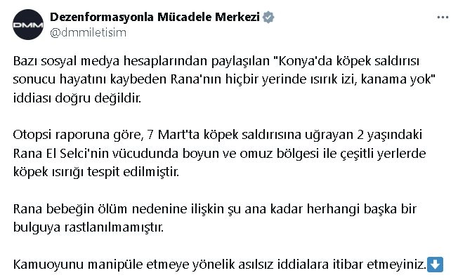 ANKARA, (DHA)- İLETİŞİM Başkanlığı Dezenformasyonla Mücadele Merkezi (DMM), Konya'da köpek saldırısı sonucu hayatını kaybeden Suriye uyruklu Rana El Selci'nin (2) vücudunda ısırık izi olmadığına dair iddianın doğru olmadığını açıkladı. DMM'nin sosyal medya hesabından yapılan açıklamada, "Bazı sosyal medya hesaplarından paylaşılan 'Konya'da köpek saldırısı sonucu hayatını kaybeden Rana'nın hiçbir yerinde ısırık izi, kanama yok' iddiası doğru değildir. Otopsi raporuna göre, 7 Mart'ta köpek saldırısına uğrayan 2 yaşındaki Rana El Selci'nin vücudunda boyun ve omuz bölgesi ile çeşitli yerlerde köpek ısırığı tespit edilmiştir. Rana bebeğin ölüm nedenine ilişkin şu ana kadar herhangi başka bir bulguya rastlanılmamıştır. Kamuoyunu manipüle etmeye yönelik asılsız iddialara itibar etmeyiniz" denildi. (DHA)