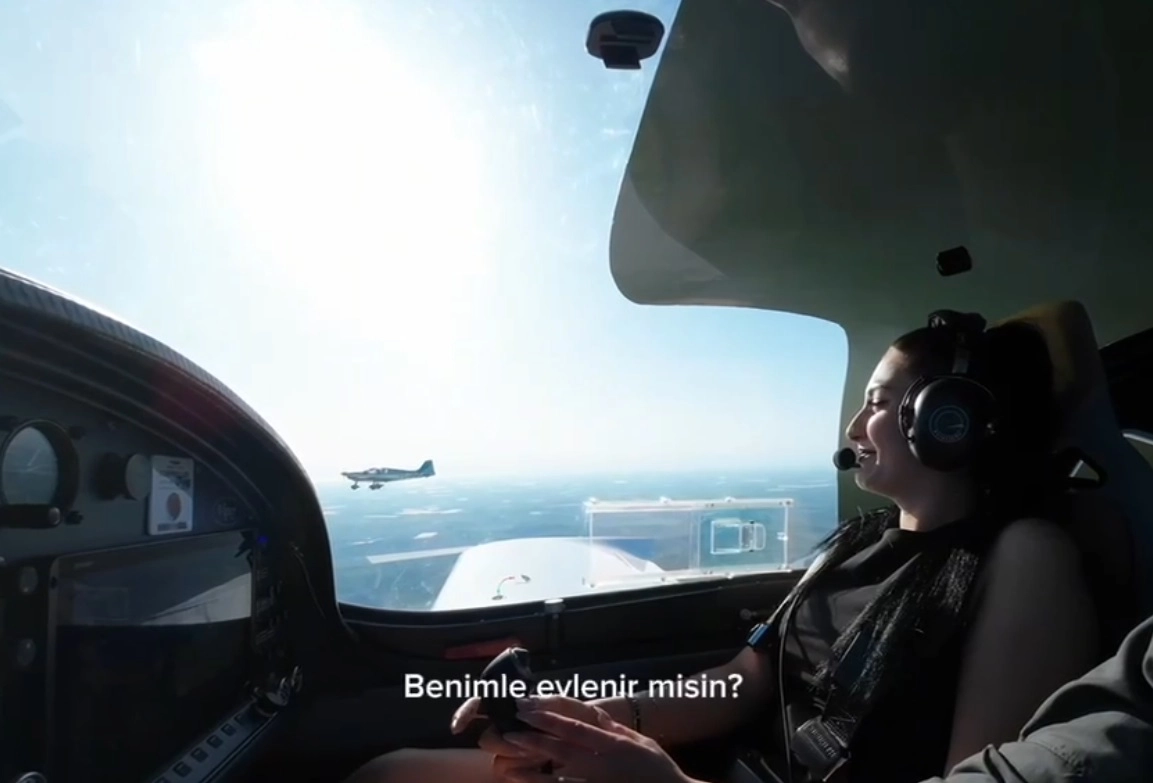 Serhat GÜLER/ADANA, (DHA)- ADANA'da Metin Topal (23), sevgilisi Sebihe Nur Özerten'e (23) farklı uçaklarda uçuş yaparken telsizle evlilik teklifi yaptı. Teklifi kabul eden Özerten, "Diz çökmemek için yaptın bunu değil mi?" diyerek karşılık verdi.Kentte oto kiralama işiyle uğraşan Metin Topal, beden eğitimi öğretmeni sevgilisi Sebihe Nur Özerten'e sürpriz evlilik teklifi planı yaptı. Kentteki bir uçuş okuluyla anlaşan Topal, iki farklı uçak kiralayarak gökyüzünde gezinti yaptı. Metin Topal, havada sevgilisinin bulunduğu uçakla kol uçuşu yaparken telsizden anons geçerek "Aşkım yeryüzünde tanıştık. Böyle bir ilki yaşattığım için mutluyum. Umarım sen de mutlusundur. Geri kalan hayatımıza sonsuz bir aşk bulalım istiyorum. Benimle evlenir misin?" dedi. Şaşkınlık yaşayan Özerten, teklifi kabul ederek, "Diz çökmemek için yaptın bunu değil mi?" diyerek karşılık verdi. Gezinin ardından piste iniş yapan Metin Topal, Özerten'in önünde diz çökerek yeniden teklifte bulunup, yüzüğünü sundu. Genç çiftin, paylaştığı uçak kamerasına yansıyan görüntüler ilgi gördü. (DHA)