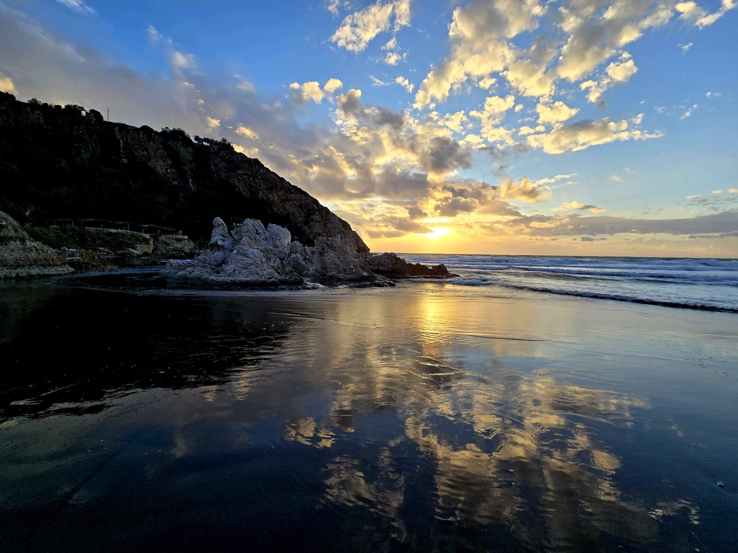 İlçenin Meydan Mahallesi sahilinde gökyüzünü kaplayan bulutların arasından gün batımında yeryüzüne doğru inen ışık huzmeleri, deniz yüzeyinde altın sarısı yansımalar meydana getirdi. Akşam saatlerinde etkisini artıran rüzgarla birlikte dalga boyu yükselirken, güneşin ufuk çizgisine yaklaşmasıyla gökyüzünde sarı ve turuncu tonlar hakim oldu. Deniz yüzeyinde oluşan yansımalar bölgede güzel görüntü oluşturdu. (DHA)