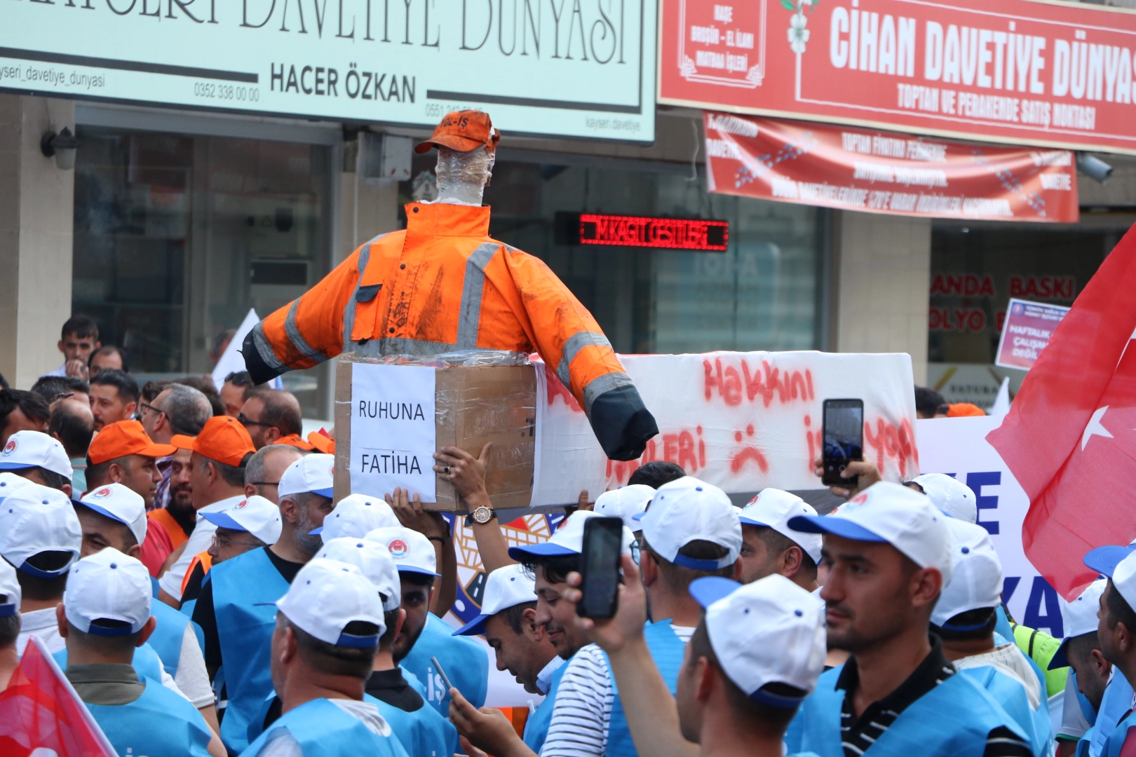 Furkan KAVUKLU/ KAYSERİ, (DHA)- KAYSERİ’de Türkiye İşçi Sendikaları Konfederasyonu’na (TÜRK-İŞ) bağlı sendika üyeleri, maaş zammı talebinde bulunarak, tabutlu eylem yaptı. Kocasinan ilçesi Sahabiye Mahallesi’ndeki TÜRK-İŞ binası önünde toplanan kalabalık, zam talebinde bulunarak sloganlar attı. Çok sayıda sendika üyesi sloganlar atarak Cumhuriyet Meydanı’na yürüdü. Polis tarafından geniş güvenlik önlemlerinin alındığı eyleme, bir grup tarafından hazırlanan ‘Ruhuna fatiha, kamu işçisi öldü’ yazılı tabut getirildi. TÜRK-İŞ Kayseri İl Başkanı İdris Güven, “Biz kamuda çalışan işçiler olarak; 2025 yılı Toplu İş Sözleşme sürecinde karşılanmayan taleplerimiz, ücret artışımız ve haklarımız için verdiğimiz mücadeleden asla vazgeçmeyeceğimizi her fırsatta dile getirdik. Bu kararlı duruşumuzun bir parçası olarak eylem planımızı kamuoyuna basın aracılığıyla duyurduk. Geçtiğimiz hafta, 81 ilde iş yerlerimizin önünde bildirilerimizi okuduk. Uyardık, çağrıda bulunduk, ‘geçim derdi büyüdü, bu teklif toplu sözleşme değil, toplu oyalamadır. İşçiyi, emekçiyi açlığa mahkum etmektir’ dedik. Bugün, eylem planımız doğrultusunda bir adım daha atıyoruz. Alanlardayız, meydanlardayız. Kitlesel olarak sesimizi yükselteceğiz” dedi. (DHA)