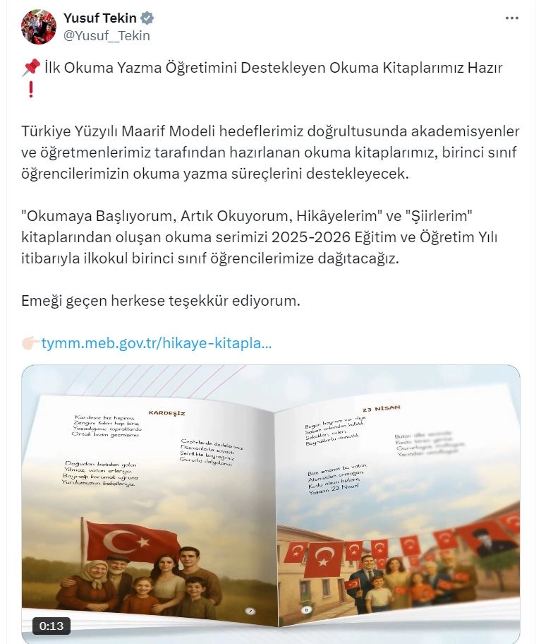 ANKARA, (DHA)- MİLLİ Eğitim Bakanı Yusuf Tekin, 2025-2026 eğitim ve öğretim yılı itibarıyla ilkokul birinci sınıf öğrencilerine okuma kitapları dağıtılacağını duyurdu.Bakan Tekin, sosyal medya hesabından yaptığı açıklamada, "İlk okuma yazma öğretimini destekleyen okuma kitaplarımız hazır. Türkiye Yüzyılı Maarif Modeli hedeflerimiz doğrultusunda akademisyenler ve öğretmenlerimiz tarafından hazırlanan okuma kitaplarımız, birinci sınıf öğrencilerimizin okuma yazma süreçlerini destekleyecek. 'Okumaya Başlıyorum, Artık Okuyorum, Hikayelerim' ve 'Şiirlerim' kitaplarından oluşan okuma serimizi 2025-2026 eğitim ve öğretim yılı itibarıyla ilkokul birinci sınıf öğrencilerimize dağıtacağız. Emeği geçen herkese teşekkür ediyorum" ifadelerini kullandı. (DHA)