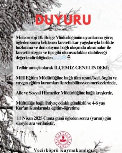 Göktan TEKER/VEZİRKÖPRÜ (Samsun), (DHA)- SAMSUN'un Vezirköprü ve Kavak ilçelerinde beklenen kar yağışı, buzlanma ve tipi nedeniyle eğitim-öğretime bugün öğleden sonra ara verildi.Meteoroloji 10'uncu Bölge Müdürlüğü'nün uyarılarının ardından, Vezirköprü ve Kavak kaymakamlıkları, olumsuz hava koşulları sebebiyle ilçede tedbir amaçlı eğitime ara verildiğini duyurdu. Yapılan açıklamalarda, cuma günü öğleden sonra başlaması beklenen yoğun kar yağışıyla buzlanma, don ve kuvvetli rüzgar nedeniyle ulaşımda aksamalar yaşanabileceği belirtildi. Açıklamada ayrıca, "İlçe genelinde; Milli Eğitim Müdürlüğü’ne bağlı tüm resmi/özel, örgün ve yaygın eğitim kurumları ile rehabilitasyon merkezlerinde, Aile ve Sosyal Hizmetler Müdürlüğü’ne bağlı kreşlerde, Müftülüğe bağlı ihtiyaç odaklı gündüzlü ve 4-6 yaş Kur’an kurslarında 11 Nisan 2025 Cuma günü öğleden sonra (yarım gün) eğitim-öğretime ara verilmiştir" ifadelerine yer verildi. (DHA)