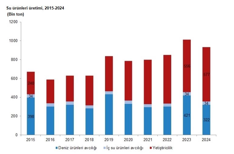 ANKARA, (DHA)- TÜRKİYE İstatistik Kurumu (TÜİK), su ürünleri üretiminin 2024 yılında bir önceki yıla göre yüzde 7,6 azalarak 933 bin 194 ton olarak gerçekleştiğini açıkladı. TÜİK, 2024 yılına ilişkin su ürünleri istatistiklerini açıkladı. Buna göre; su ürünleri üretimi 2024 yılında bir önceki yıla göre yüzde 7,6 azalarak 933 bin 194 ton olarak gerçekleşti. Üretimin yüzde 31,1'ini avcılık yoluyla elde edilen deniz balıkları, yüzde 3,5'ini avcılık yoluyla elde edilen diğer deniz ürünleri, yüzde 3,6'sını avcılık yoluyla elde edilen iç su ürünleri ve yüzde 61,8'ini yetiştiricilik ürünleri oluşturdu.SU ÜRÜNLERİ AVCILIĞI YÜZDE 21,6 AZALDISu ürünleri avcılığı bir önceki yıla göre yüzde 21,6 azaldı. Avcılık yoluyla yapılan toplam üretim 356 bin 70 ton, yetiştiricilik üretimi ise 577 bin 124 ton olarak gerçekleşti. Deniz ürünleri avcılığı bir önceki yıla göre yüzde 23,3 azalırken, iç su ürünleri avcılığı yüzde 0,2 arttı. Avlanan deniz balıkları miktarı 2024 yılında 290 bin 68 ton olarak gerçekleşti. Avlanan deniz balıklarının türlerine göre dağılımı incelendiğinde, hamsinin 153 bin 175 ton ile en yüksek miktarda avlanan balık olduğu görüldü. Hamsi balığını 49 bin 278 ton ile palamut ve 17 bin 818 ton ile sardalya takip etti.YETİŞTİRİCİLİK ÜRETİMİ YÜZDE 3,7 ARTTIYetiştiricilik üretimi bir önceki yıla göre yüzde 3,7 arttı. Yetiştiricilik yoluyla 2024 yılında yapılan üretimin 405 bin 742 tonu (yüzde 70,3) denizlerde, 171 bin 382 tonu (yüzde 29,7) iç sularda gerçekleşti. Yetiştirilen en önemli balık türleri iç sularda 170 bin 905 ton ile alabalık, denizlerde ise 165 bin 55 ton ile levrek ve 155 bin 279 ton ile çipura oldu. (DHA)