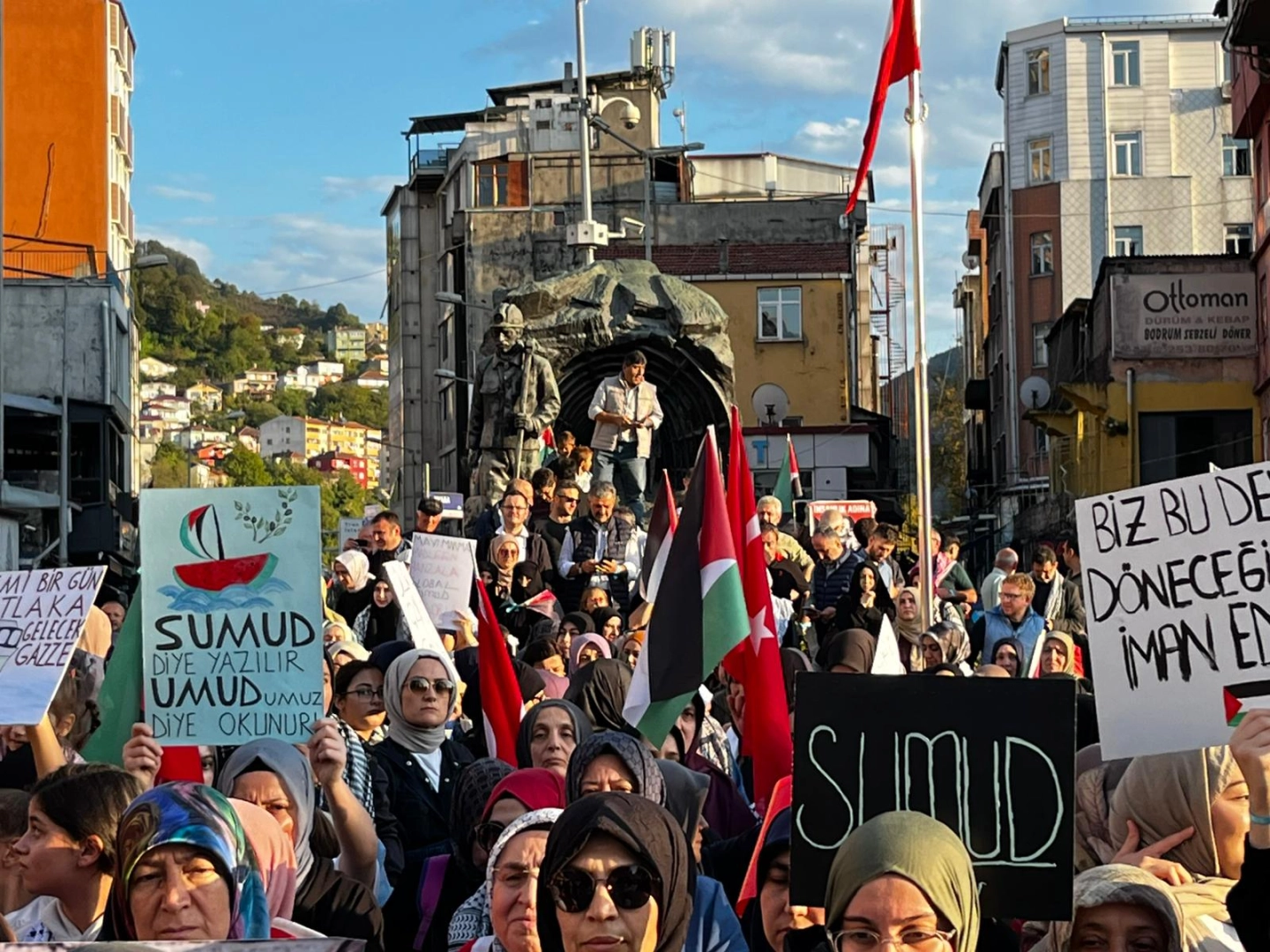 Ali Sencer ARSLAN/ ZONGULDAK, (DHA)- ZONGULDAK'ta bir araya gelen kadınlar, Küresel Sumud Filosu'na destek olmak ve İsrail’i protesto etmek için yürüyüş yaptı.Kent merkezinde, kadınlar tarafından Filistin için yürüyüş organize edildi. Grup, saat 17.00’de İstasyon Caddesi’nde buluşarak Küresel Sumud Filosu'na destek olmak ve İsrail’i protesto etmek için yürüyüş başlattı. Grup İsrail aleyhine sloganlar atarak Madenici Anıtı’na yürüdü.Gazze’de yaşanan katliama 'dur' demek için yürüdüklerini söyleyen Betül Demir, insanlık onuruna karşı suç işlendiğini belirterek, “Orada kadınlar, çocukla, yaşlılar, hastalar ve masum siviller yaşama hakkından mahrum bırakılıyor. Su, gıda ve ilaç gibi hayati önem taşıyan ne varsa abluka altında tutuluyor. Bu sadece Filistin halkına değil bütün insanlığa karşı işlenmiş bir suçtur. Bu bir cinayettir. Her geçen dakika bombalarla paramparça olan bir çocuk, yıkılan bir yuva, sönen umutlar demektir. Bizler Zonguldak'tan bu tabloya bakarken ne tarihin ne de vicdanımızın bizi affetmeyeceğini biliyoruz. Sessizlik suça ortak olmaktır. Yarın evlatlarımız, torunlarımız bize dönüp, 'Sen o gün ne yaptın? Zulme karşı çıktın mı, yoksa sessiz mi kaldın?' Dediğinde bir cevabımız olmalı. Çünkü susmak, zulmün ortağı olmaktır." dedi. (DHA)