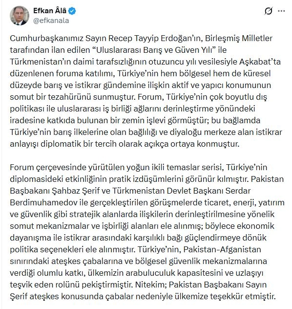 AK Parti Genel Başkan Vekili Efkan Ala, Cumhurbaşkanı Recep Tayyip Erdoğan'ın Türkmenistan temaslarına ilişkin sosyal medya hesabından değerlendirme yaptı. Ala, "Cumhurbaşkanımız Sayın Recep Tayyip Erdoğan'ın, Birleşmiş Milletler tarafından ilan edilen 'Uluslararası Barış ve Güven Yılı' ile Türkmenistan'ın daimi tarafsızlığının 30'uncu yılı vesilesiyle Aşkabat'ta düzenlenen foruma katılımı, Türkiye'nin hem bölgesel hem de küresel düzeyde barış ve istikrar gündemine ilişkin aktif ve yapıcı konumunun somut bir tezahürünü sunmuştur. Forum, Türkiye'nin çok boyutlu dış politikası ile uluslararası iş birliği ağlarını derinleştirme yönündeki iradesine katkıda bulunan bir zemin işlevi görmüştür; bu bağlamda Türkiye'nin barış ilkelerine olan bağlılığı ve diyaloğu merkeze alan istikrar anlayışı diplomatik bir tercih olarak açıkça ortaya konmuştur" dedi.