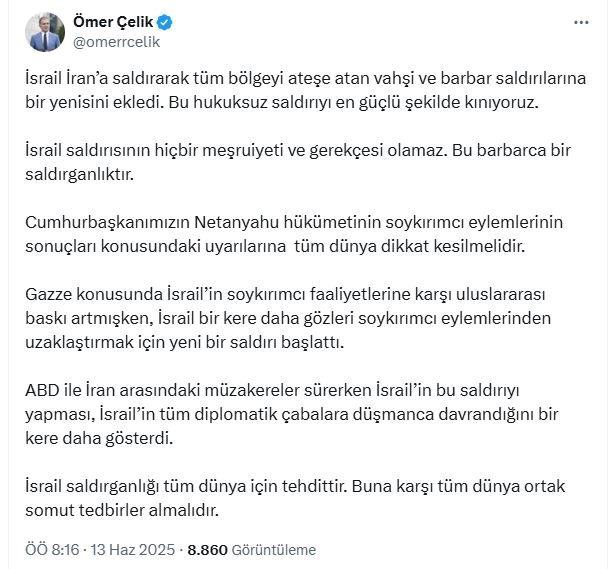 ANKARA, (DHA)- AK Parti Genel Başkan Yardımcısı ve Parti Sözcüsü Ömer Çelik, İsrail'in İran'a saldırısını en güçlü şekilde kınadıklarını açıkladı.AK Parti'li Ömer Çelik, sosyal medya hesabından yaptığı açıklamada, "İsrail İran'a saldırarak tüm bölgeyi ateşe atan vahşi ve barbar saldırılarına bir yenisini ekledi. Bu hukuksuz saldırıyı en güçlü şekilde kınıyoruz. İsrail saldırısının hiçbir meşruiyeti ve gerekçesi olamaz. Bu barbarca bir saldırganlıktır. Cumhurbaşkanımızın, Netanyahu hükümetinin soykırımcı eylemlerinin sonuçları konusundaki uyarılarına tüm dünya dikkat kesilmelidir. Gazze konusunda İsrail'in soykırımcı faaliyetlerine karşı uluslararası baskı artmışken, İsrail bir kere daha gözleri soykırımcı eylemlerinden uzaklaştırmak için yeni bir saldırı başlattı. ABD ile İran arasındaki müzakereler sürerken İsrail'in bu saldırıyı yapması, İsrail'in tüm diplomatik çabalara düşmanca davrandığını bir kere daha gösterdi. İsrail saldırganlığı tüm dünya için tehdittir. Buna karşı tüm dünya ortak somut tedbirler almalıdır" ifadelerini kullandı. (DHA)
